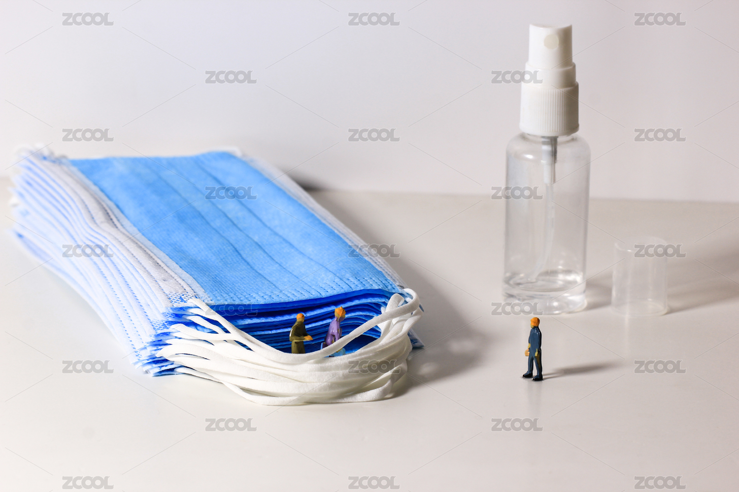 蓝色背景的桌面上散落着消毒喷雾和口罩