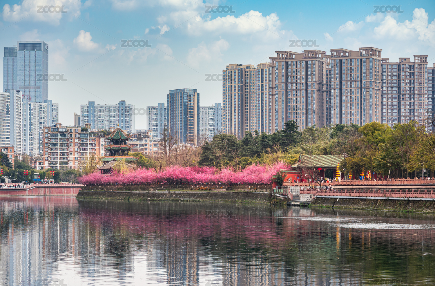 成都锦江边望江楼公园春季盛开的红梅航拍图