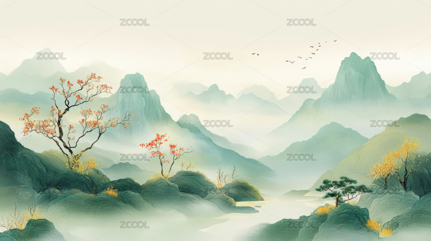 国潮古风新国风青绿山水画背景壁纸图