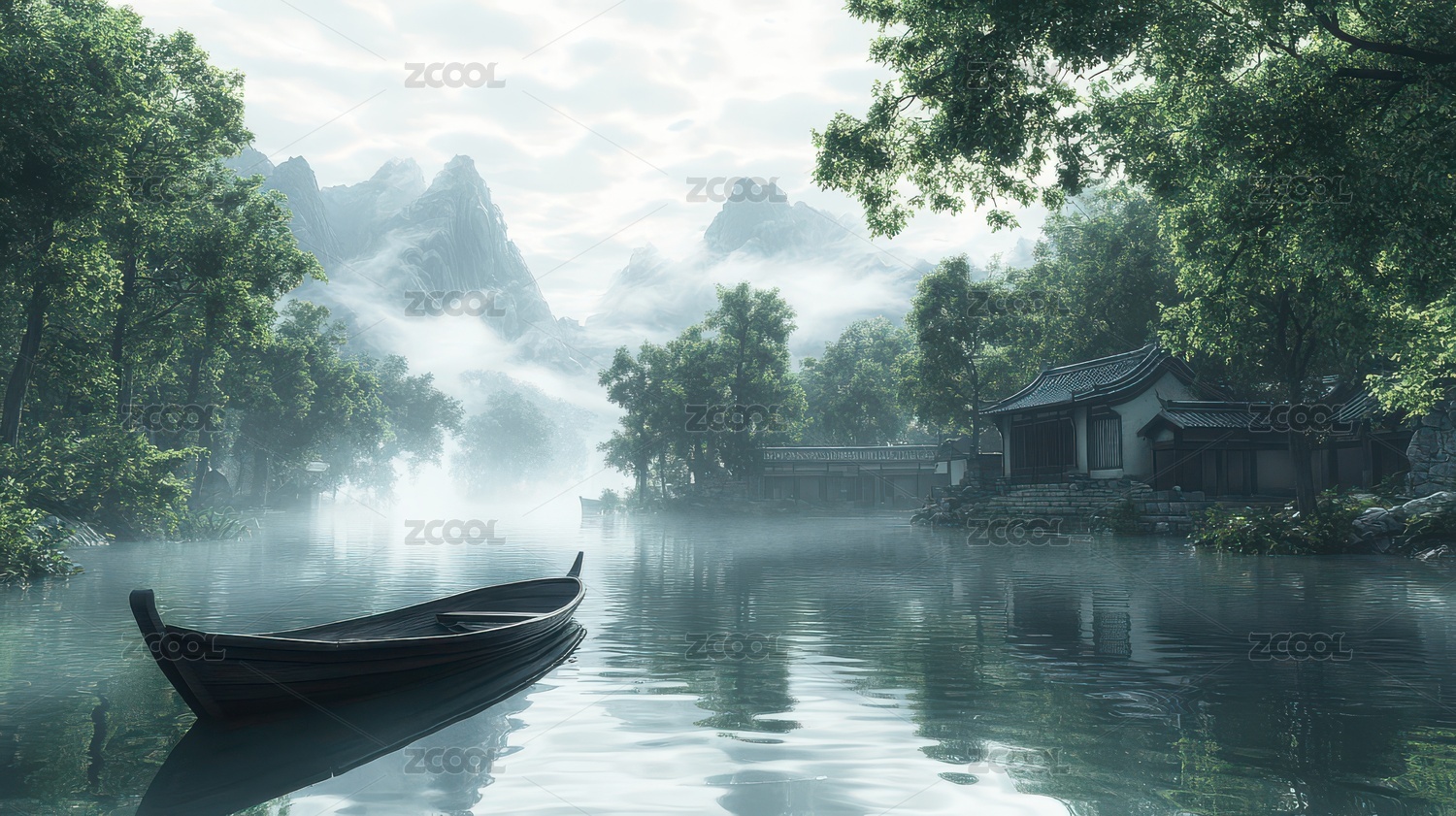 山间雾气缭绕湖泊中式建筑