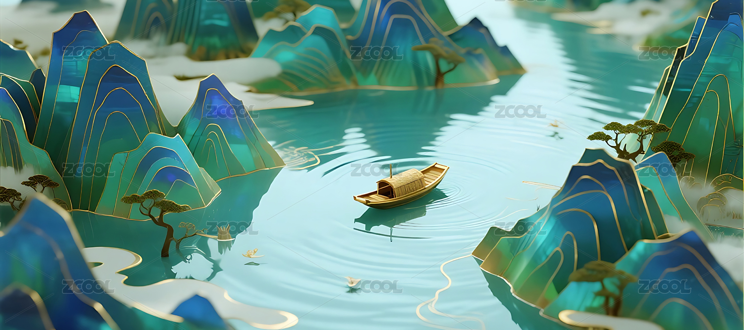 山水,卡通,峡谷,山谷,船,溪流,高山,泛舟,植被,划船