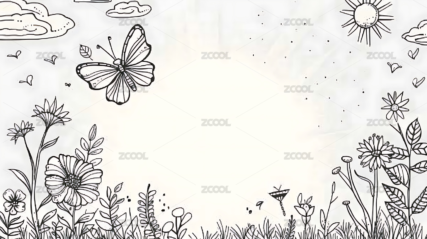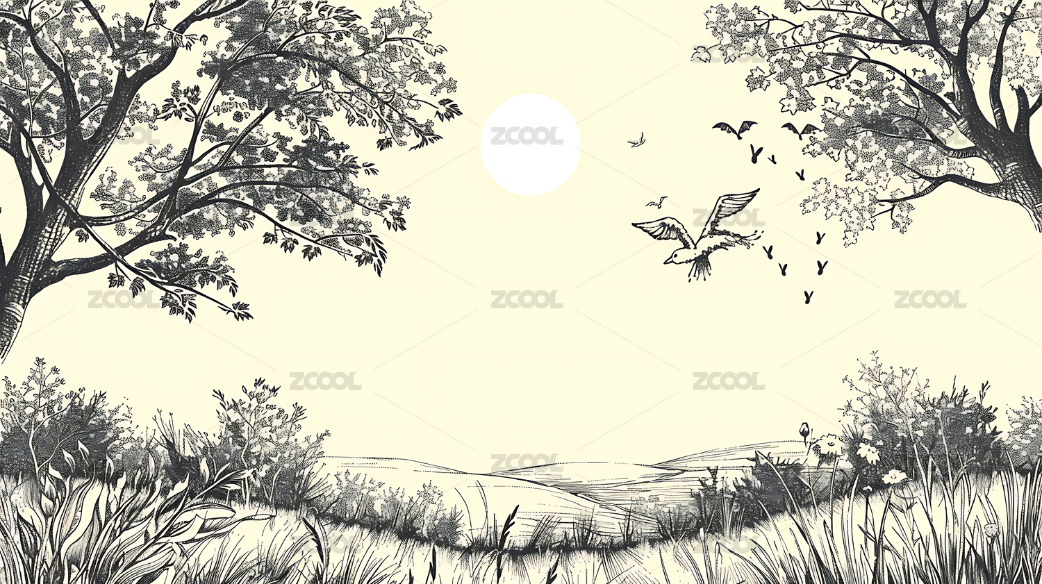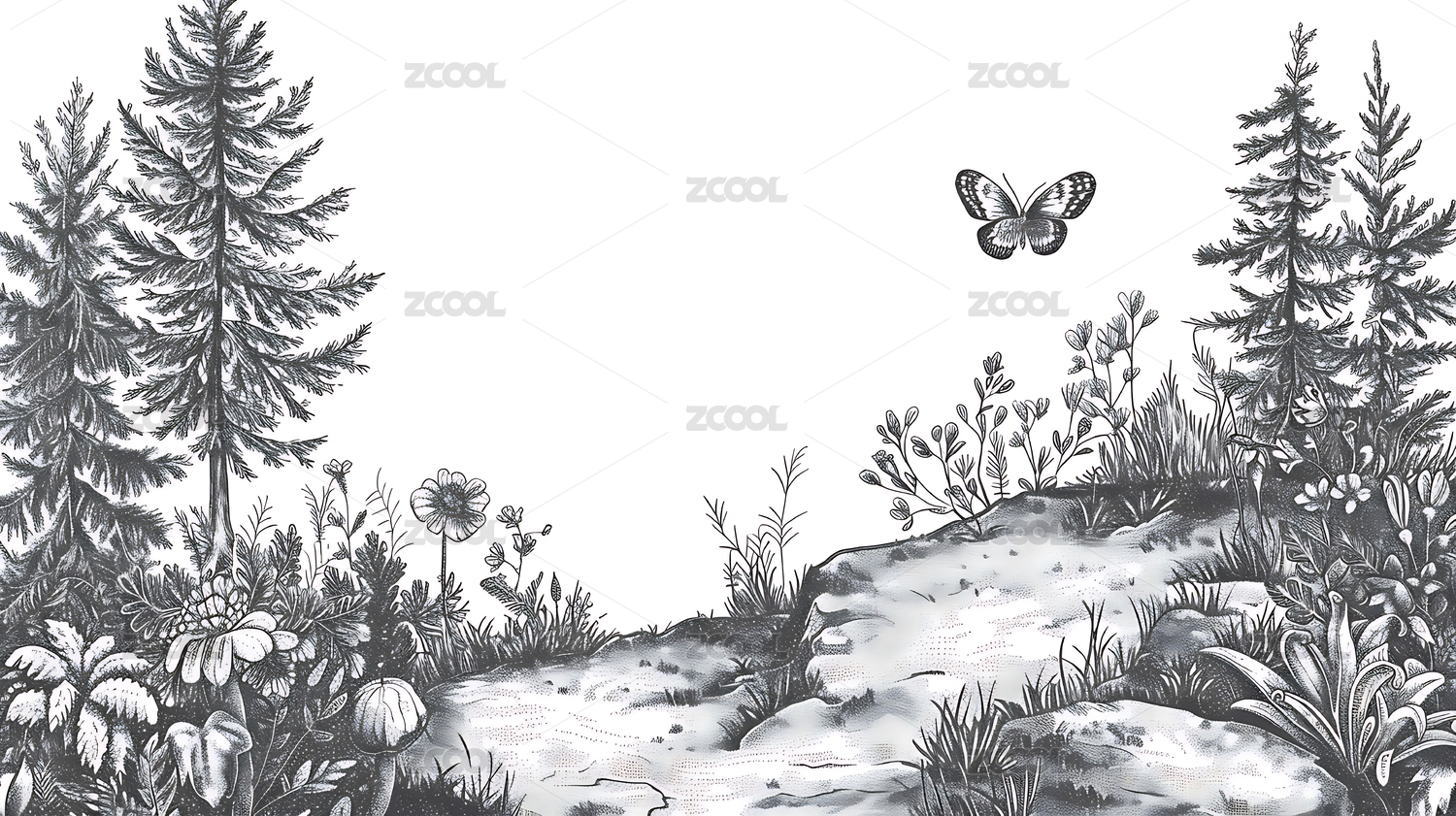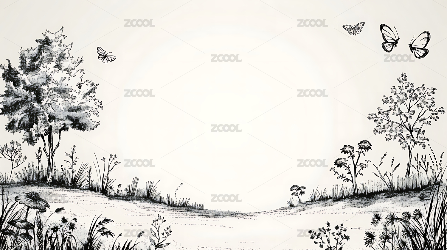 黑白传统手绘植物花卉风景线条版画