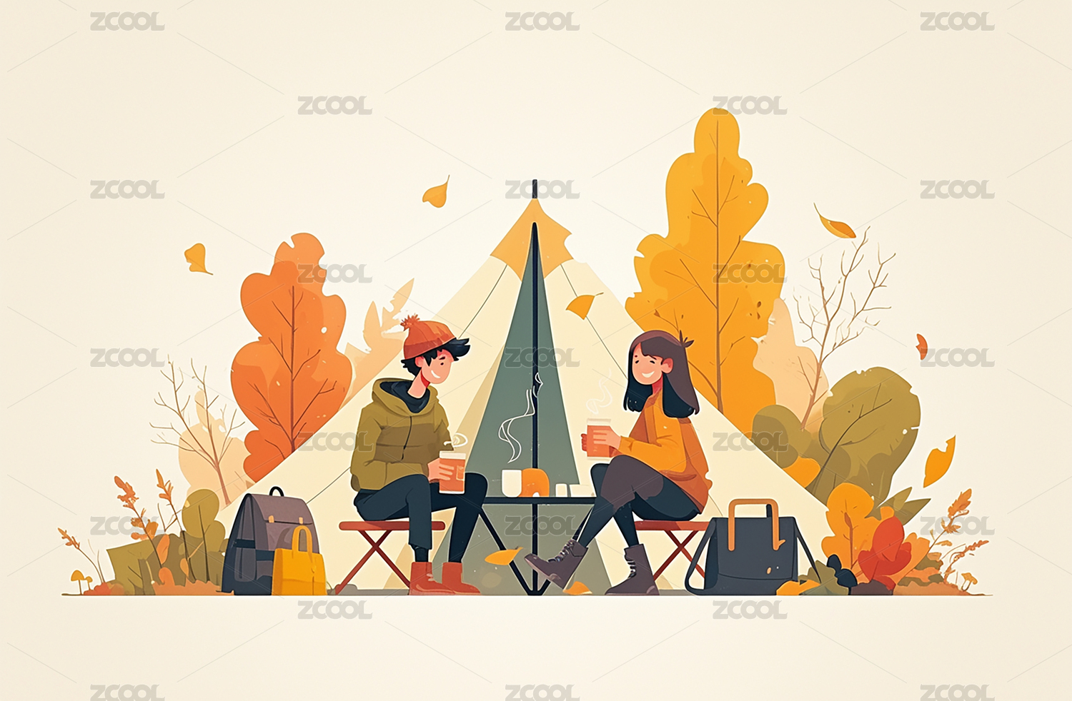 男生和女生在秋天里户外露营登山徒步的插画