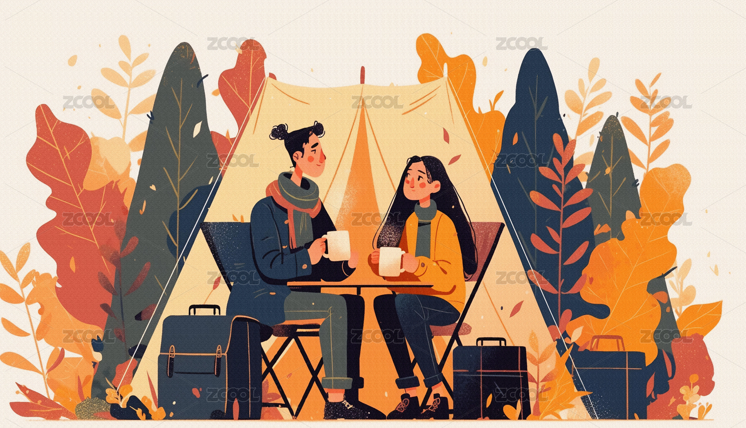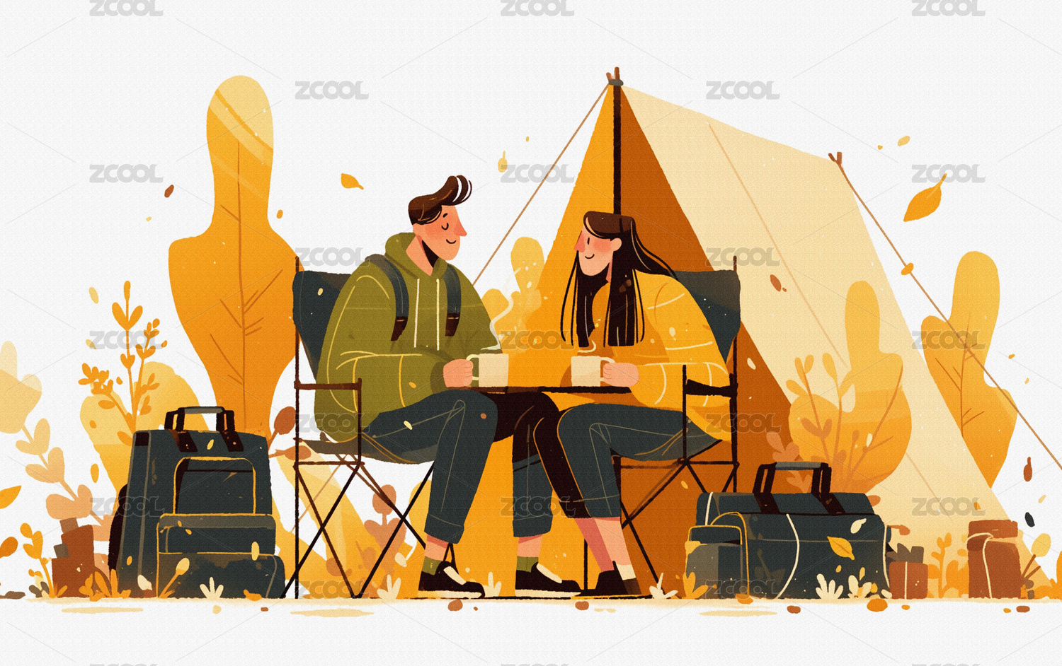秋天两个人户外露营插画