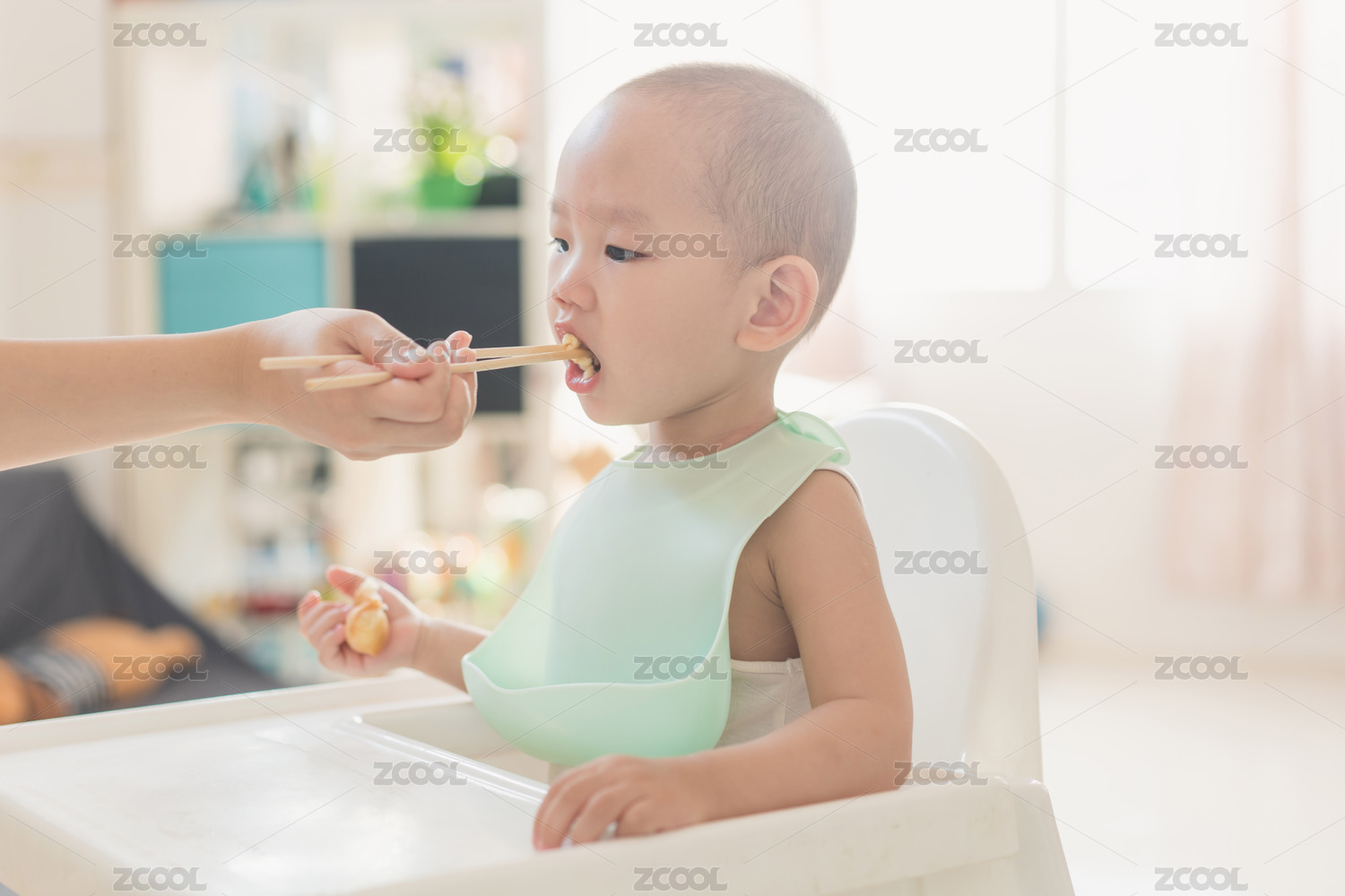 亚裔婴儿坐在飘窗上吃奶