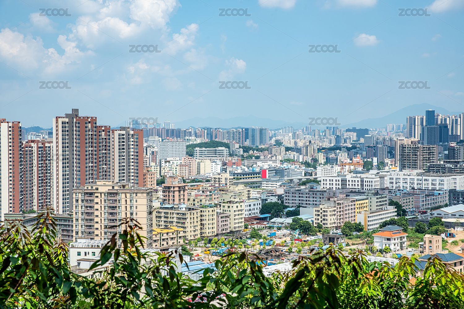 深圳龙华区的山景楼盘/蓝天白云下的城市和森林