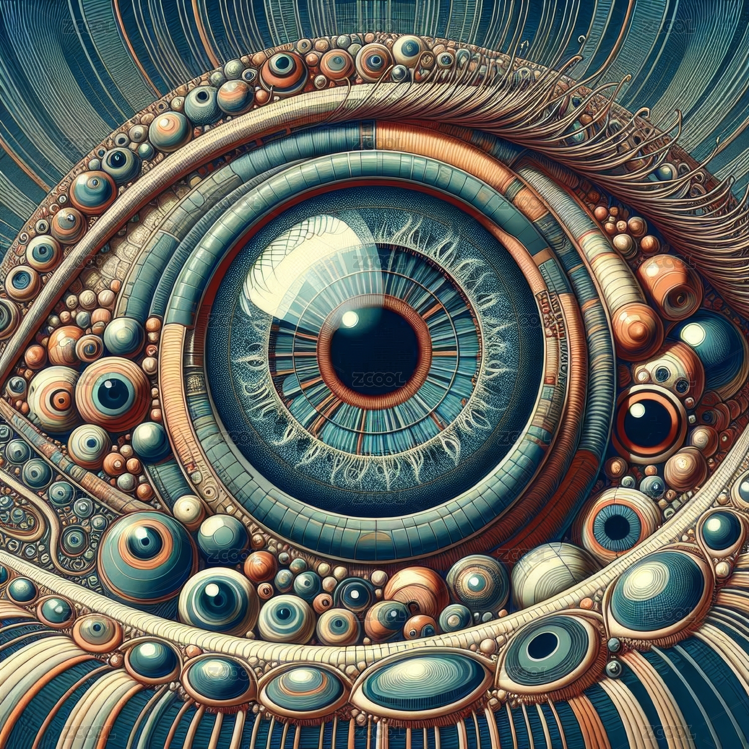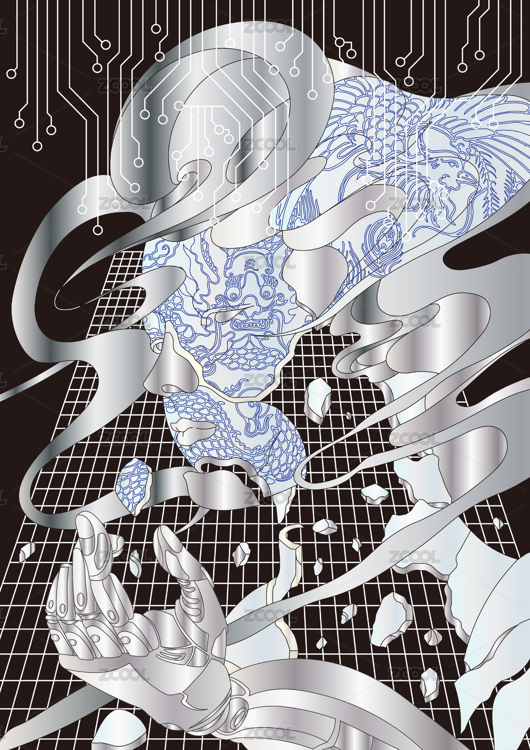 碎片中透出龙的眼睛,空间分割错位,细线描