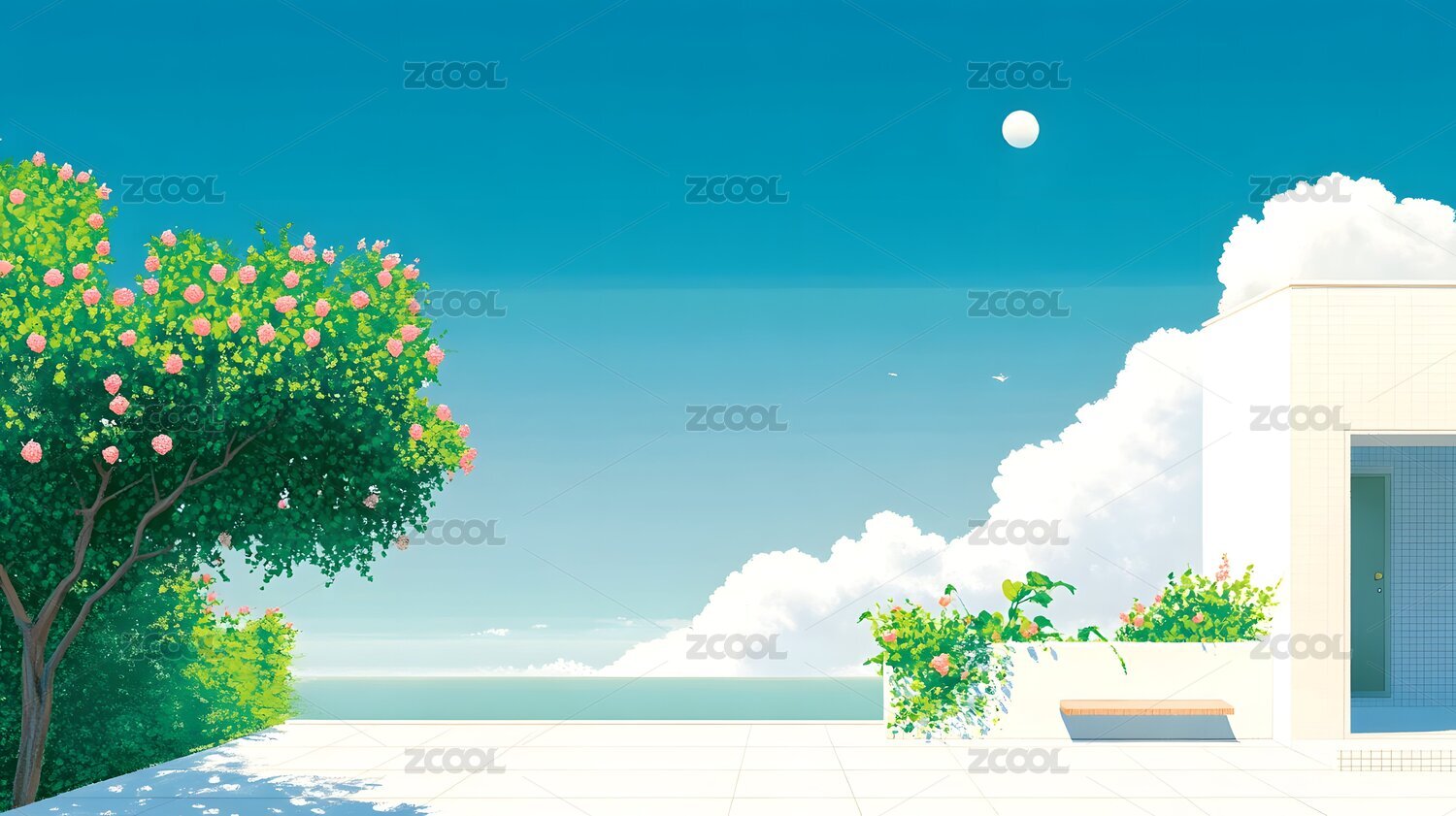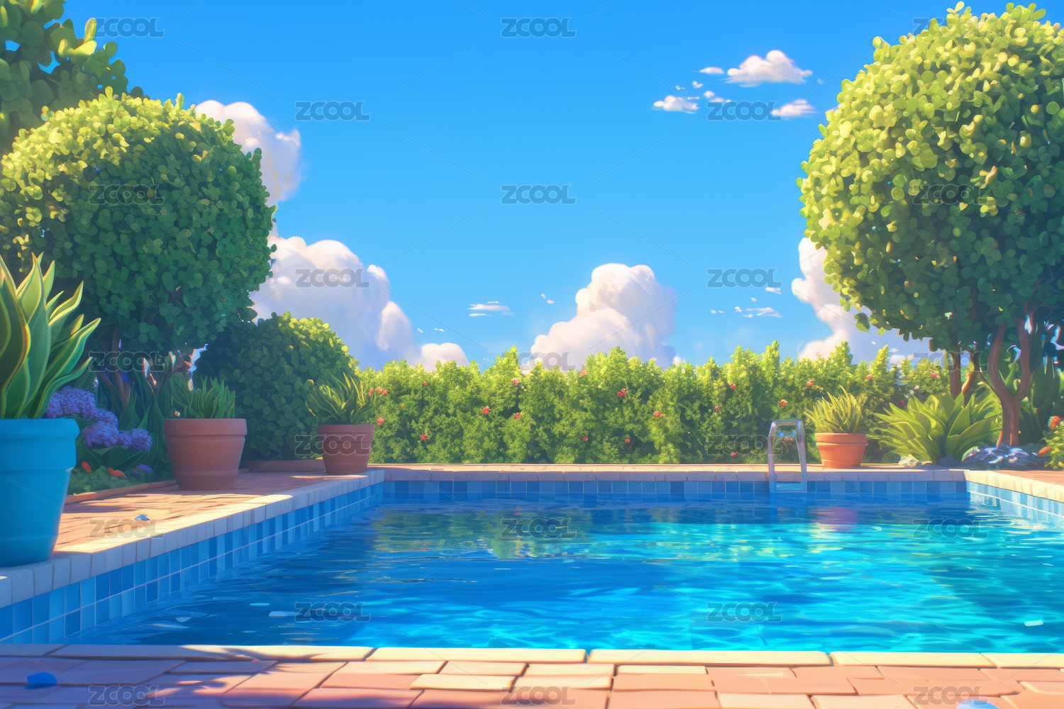 插画,夏日泳池,宁静,白日,蓝天白云下