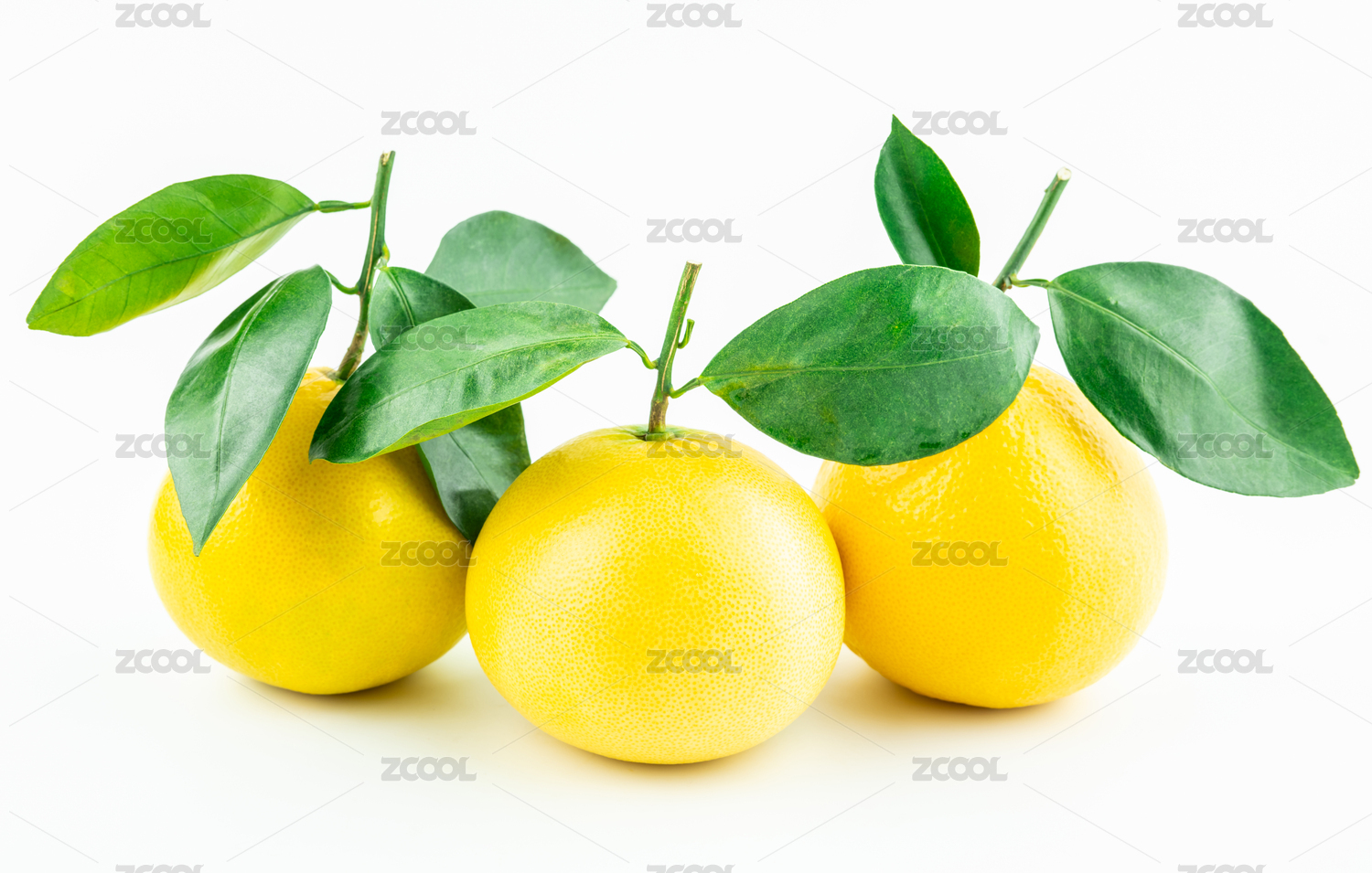 新鲜带叶子的黄色柠檬在白背景上