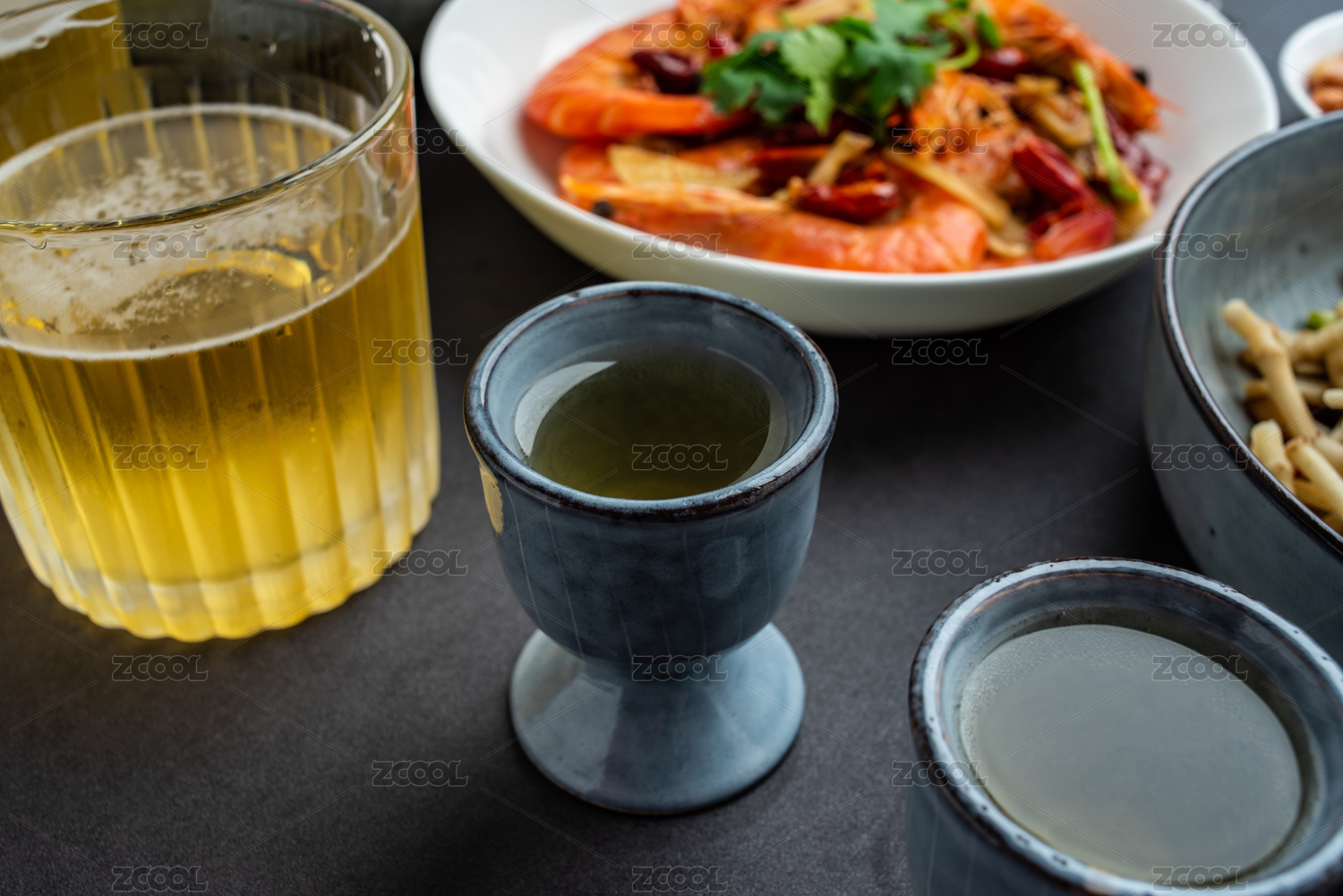 两杯清酒和家常小菜香辣虾凉拌黄瓜