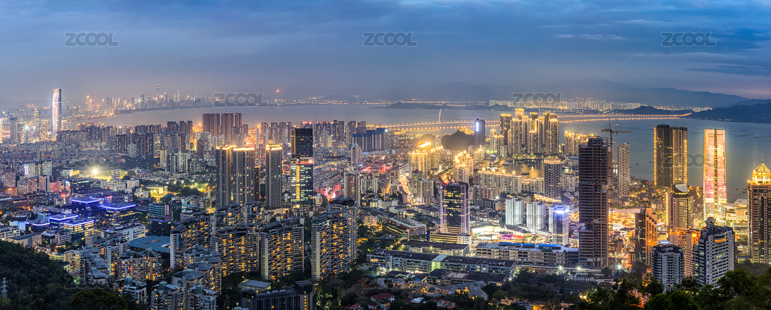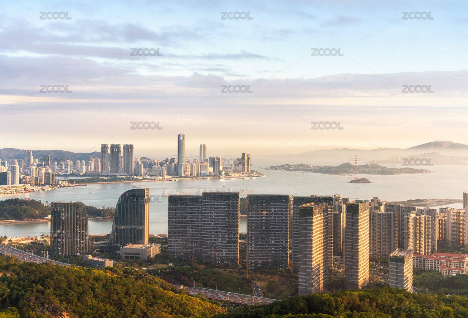 中国福建省厦门市现代高层建筑夕阳远景俯拍图