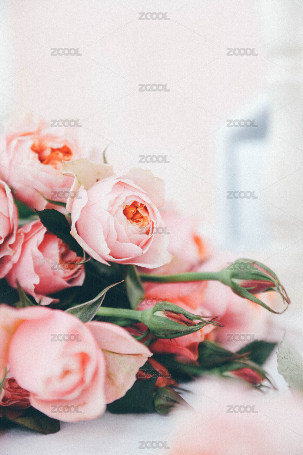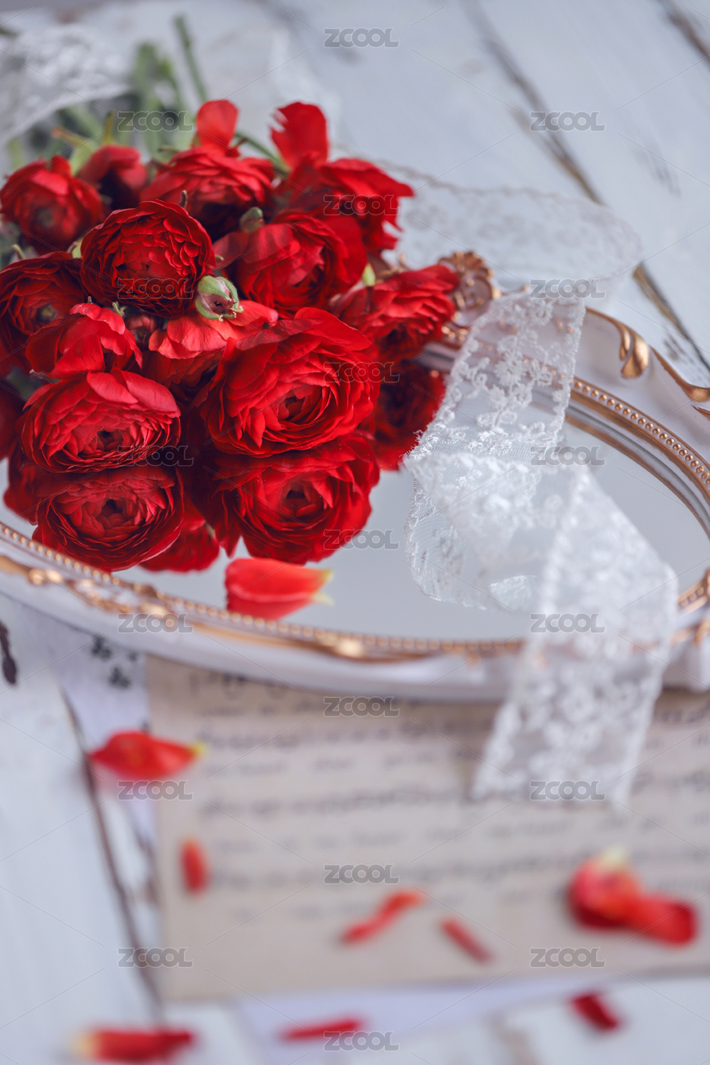 桌上玫瑰花束与散落花瓣