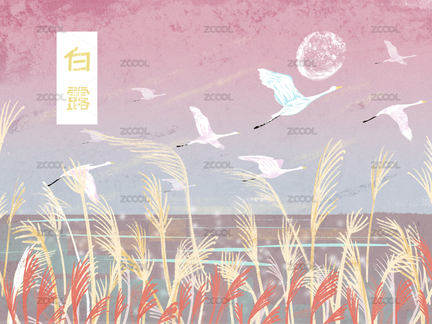 唯美飞鹤芦苇中国风手绘山水画