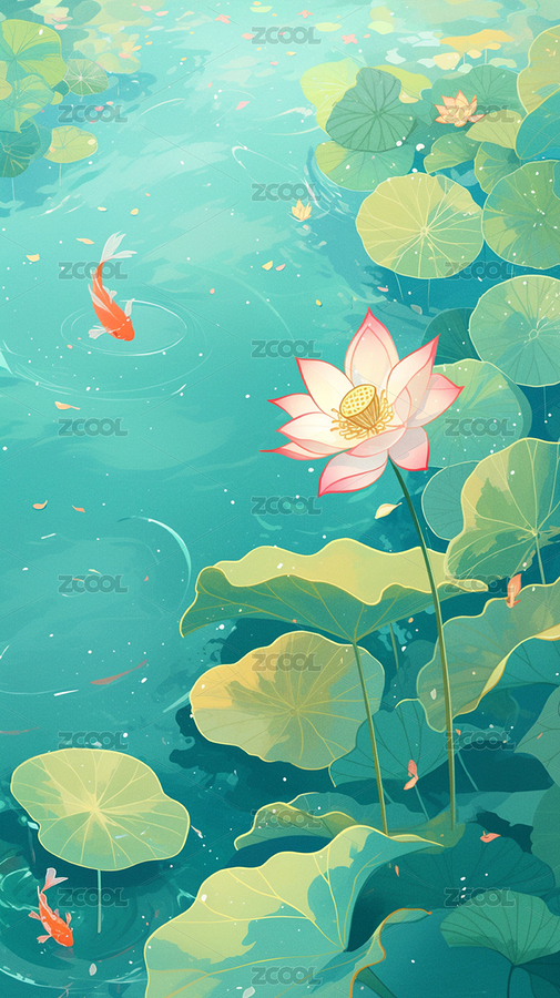 AIGCFG,国潮,鱼,锦鲤,水波纹,荷叶,荷花,夏天,古风,国风