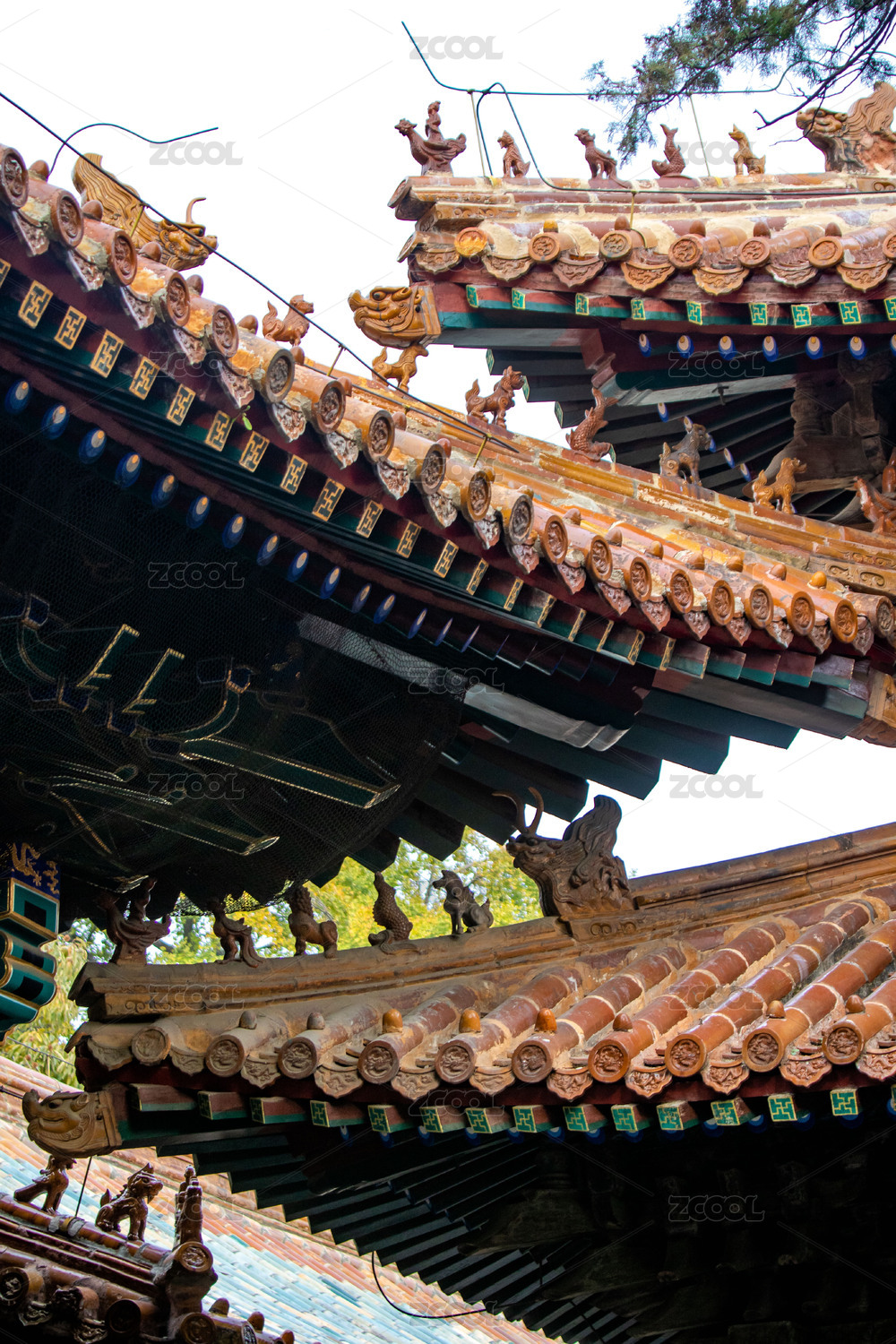 蓝天下的北京中山公园宰牲亭屋顶房檐特写