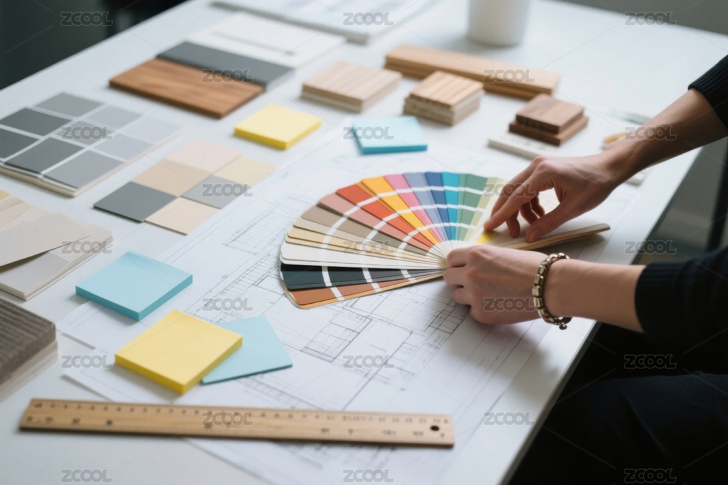 设计师挑选色彩样本与材料