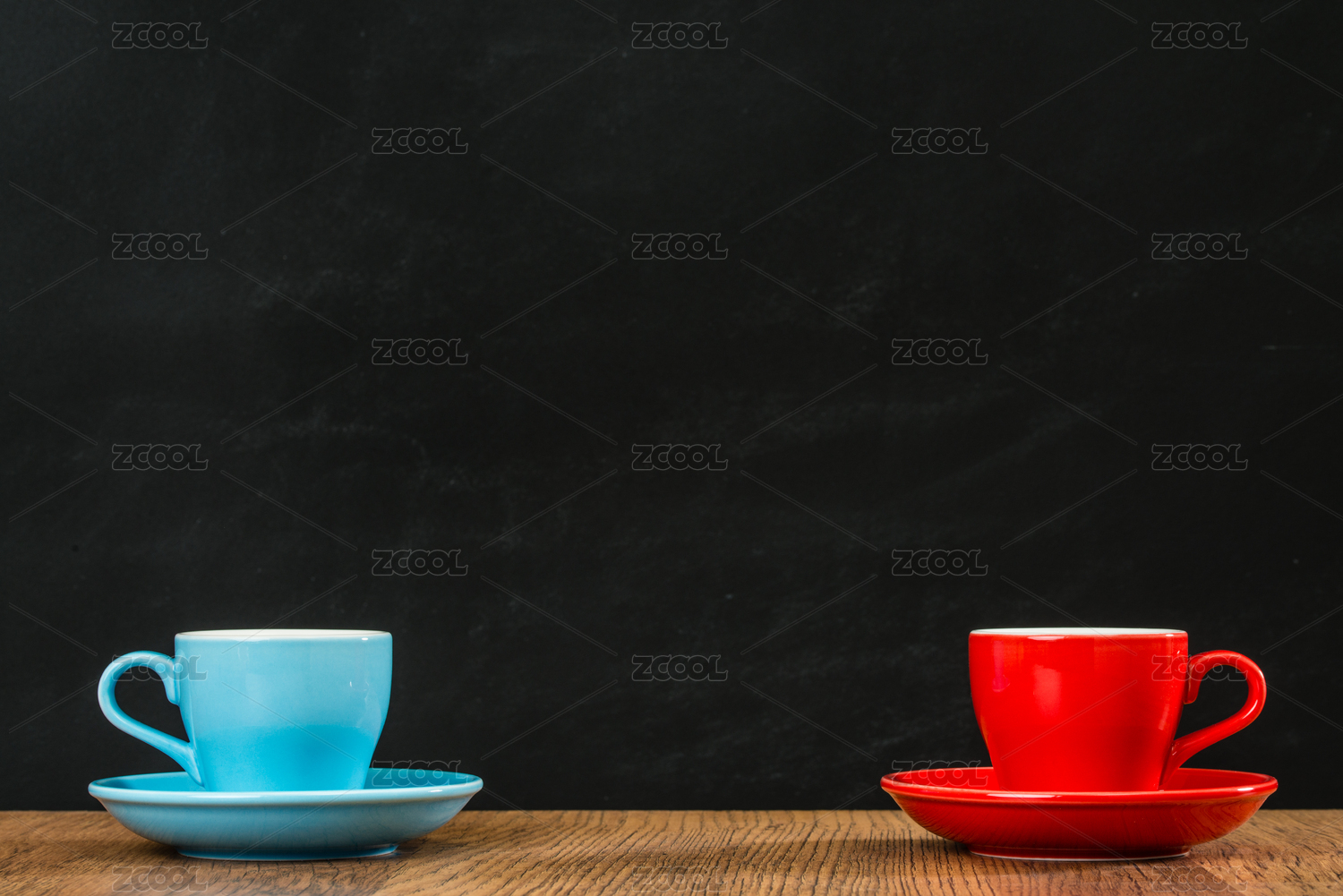 上显示与黑板空墙背景的广告创意区COPYSPACE古老的木质感表丰富多彩的蓝色和红色咖啡杯。
