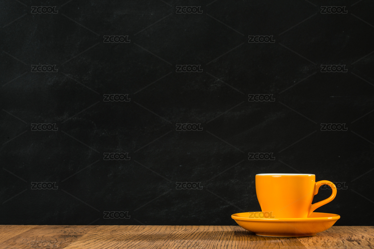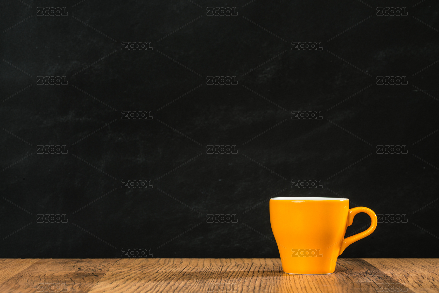黄色咖啡杯黑色黑板墙的背景上餐厅木纹地板桌子充满热咖啡饮用的地方。
