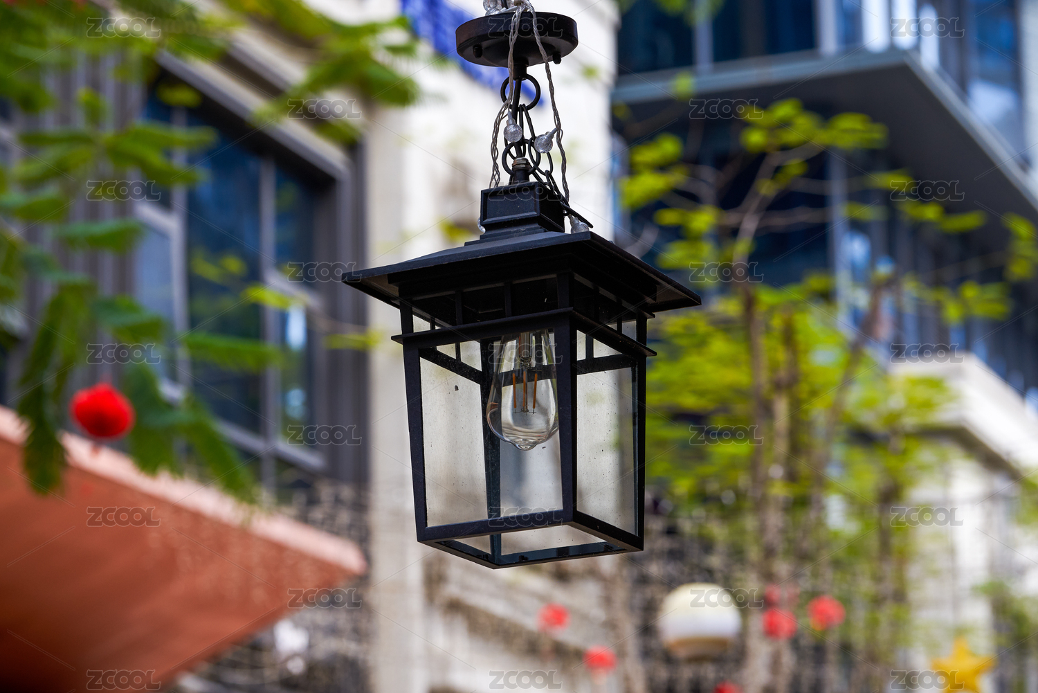 古典建筑街区里悬挂的复古吊灯特写