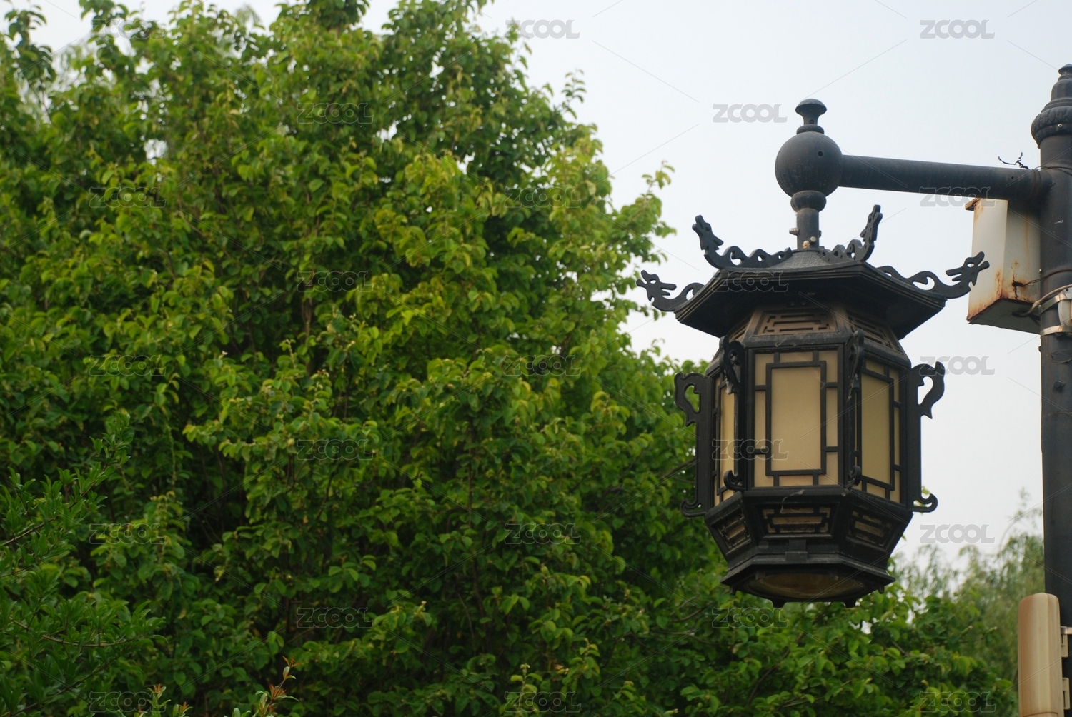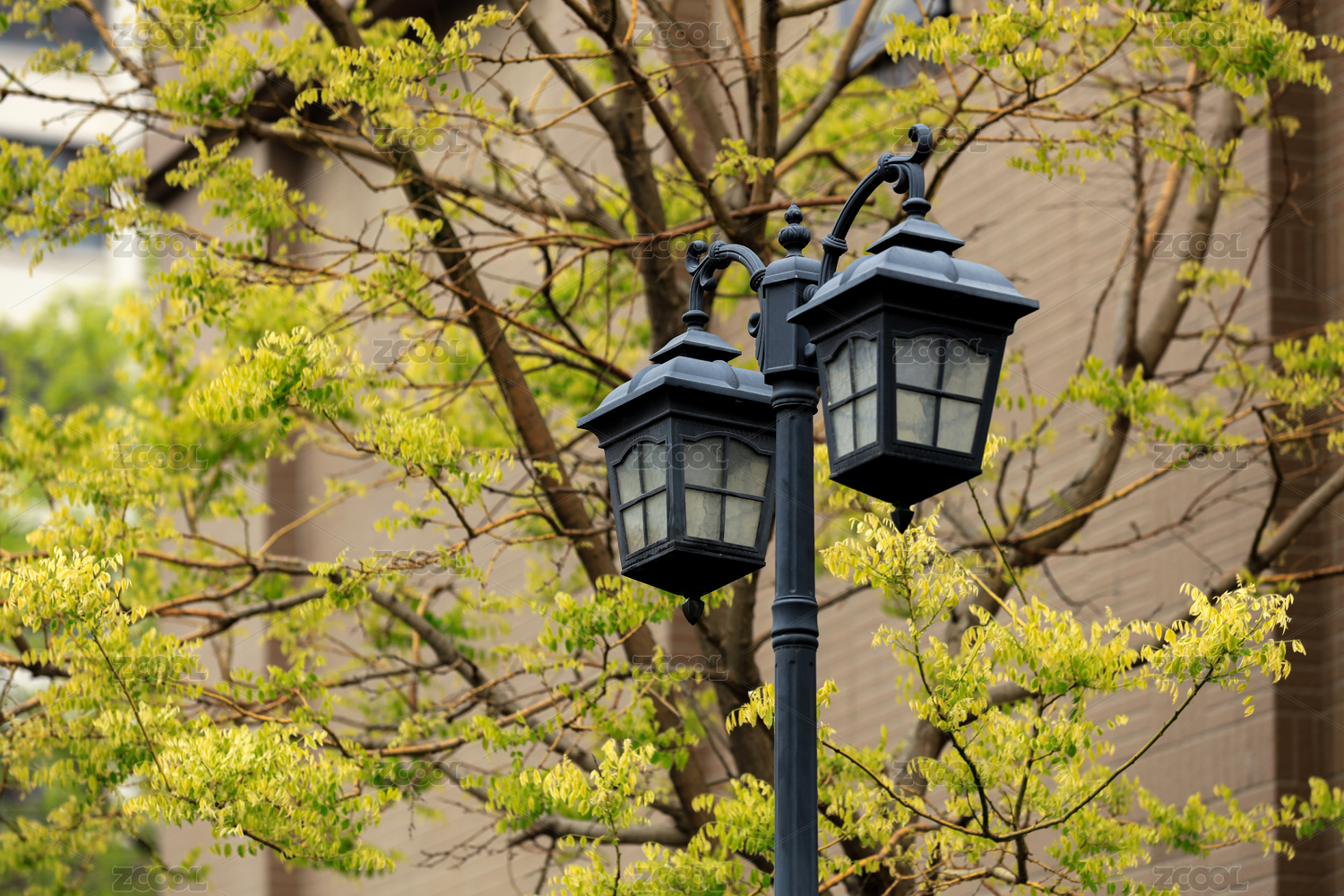 掩映在绿树中的一盏欧式路灯