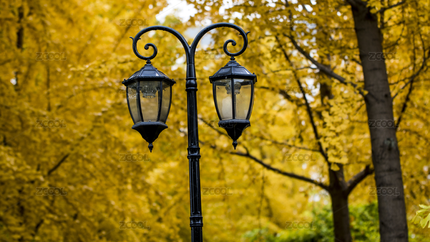 在金黄色树叶背景前的一对路灯