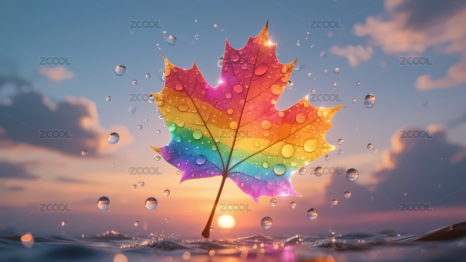 彩虹枫叶夕阳水面