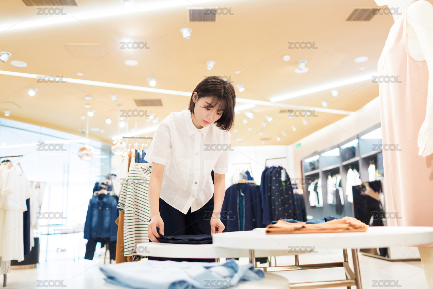 年轻漂亮的年轻女性在商场寻找挑选试穿服装