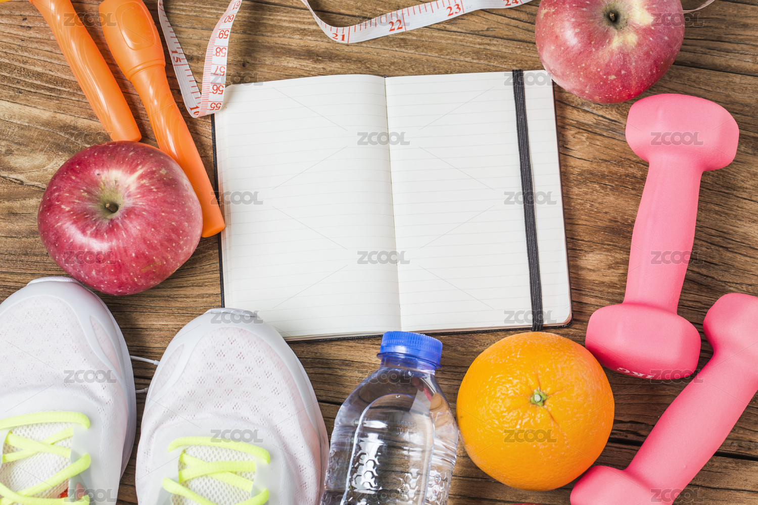 形状,健美,运动,健康,苗条,哑铃,跑鞋,水,苹果,概念