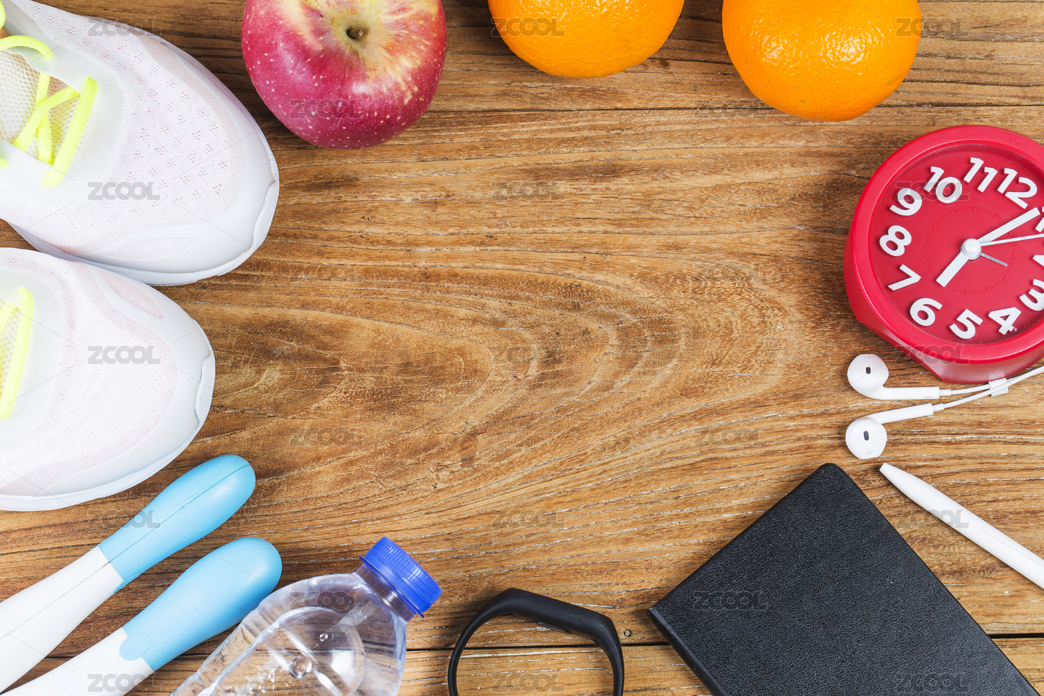 灰色木制背景上的运动鞋子、耳机、毛巾、哑铃、橙子和梨