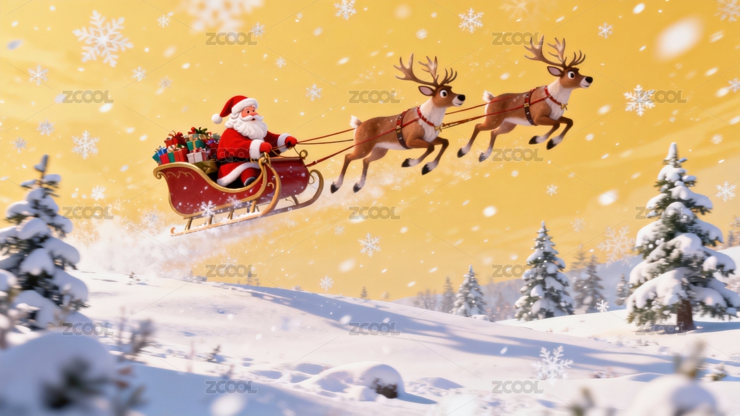 圣诞老人驾驯鹿雪橇飞越雪景