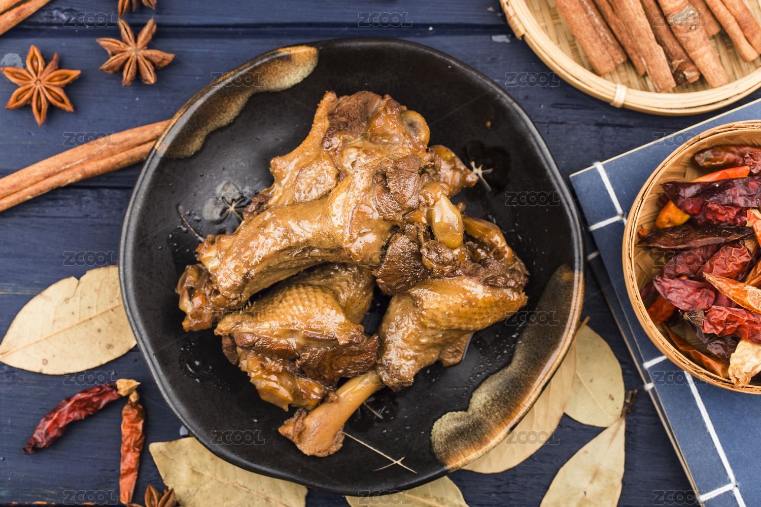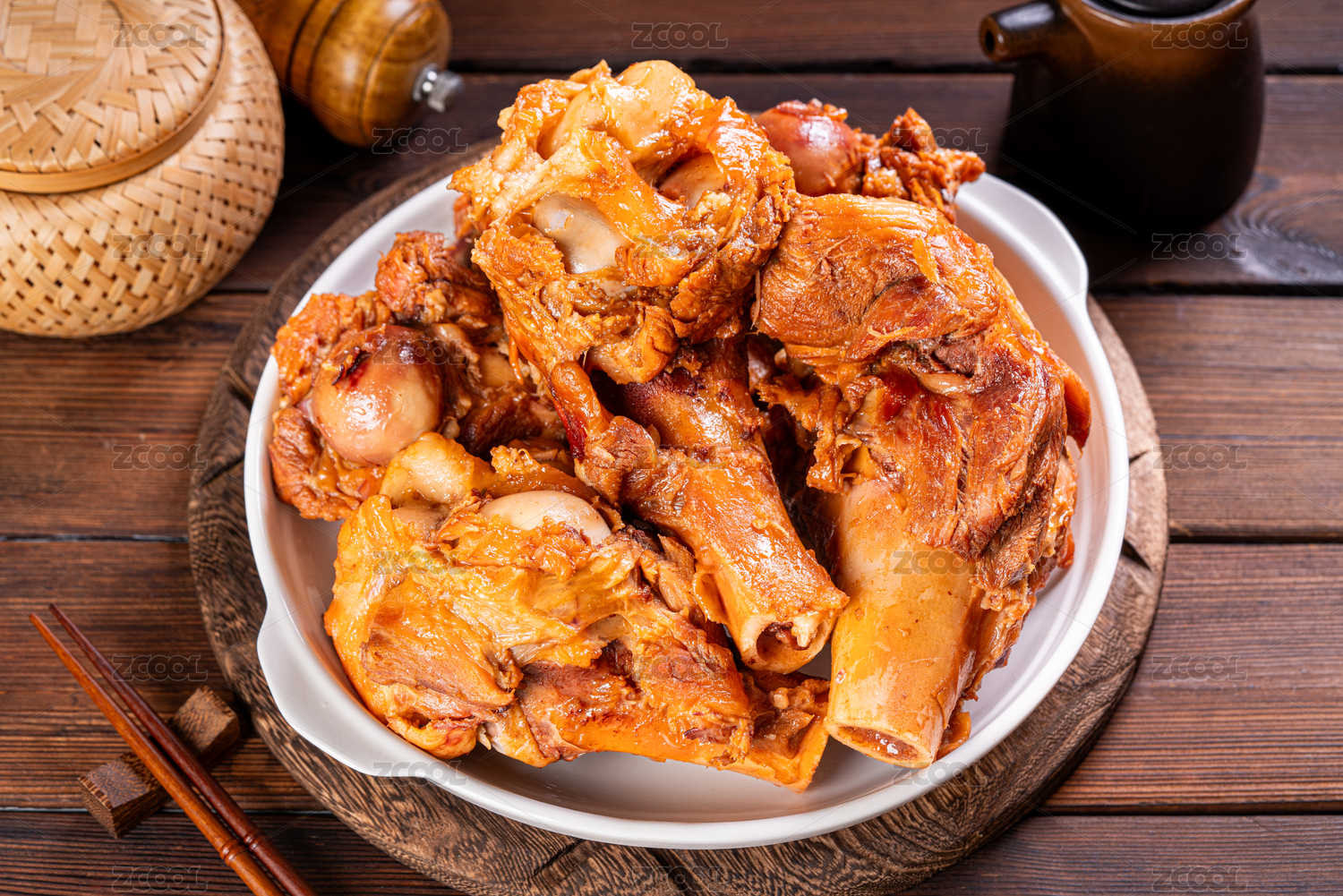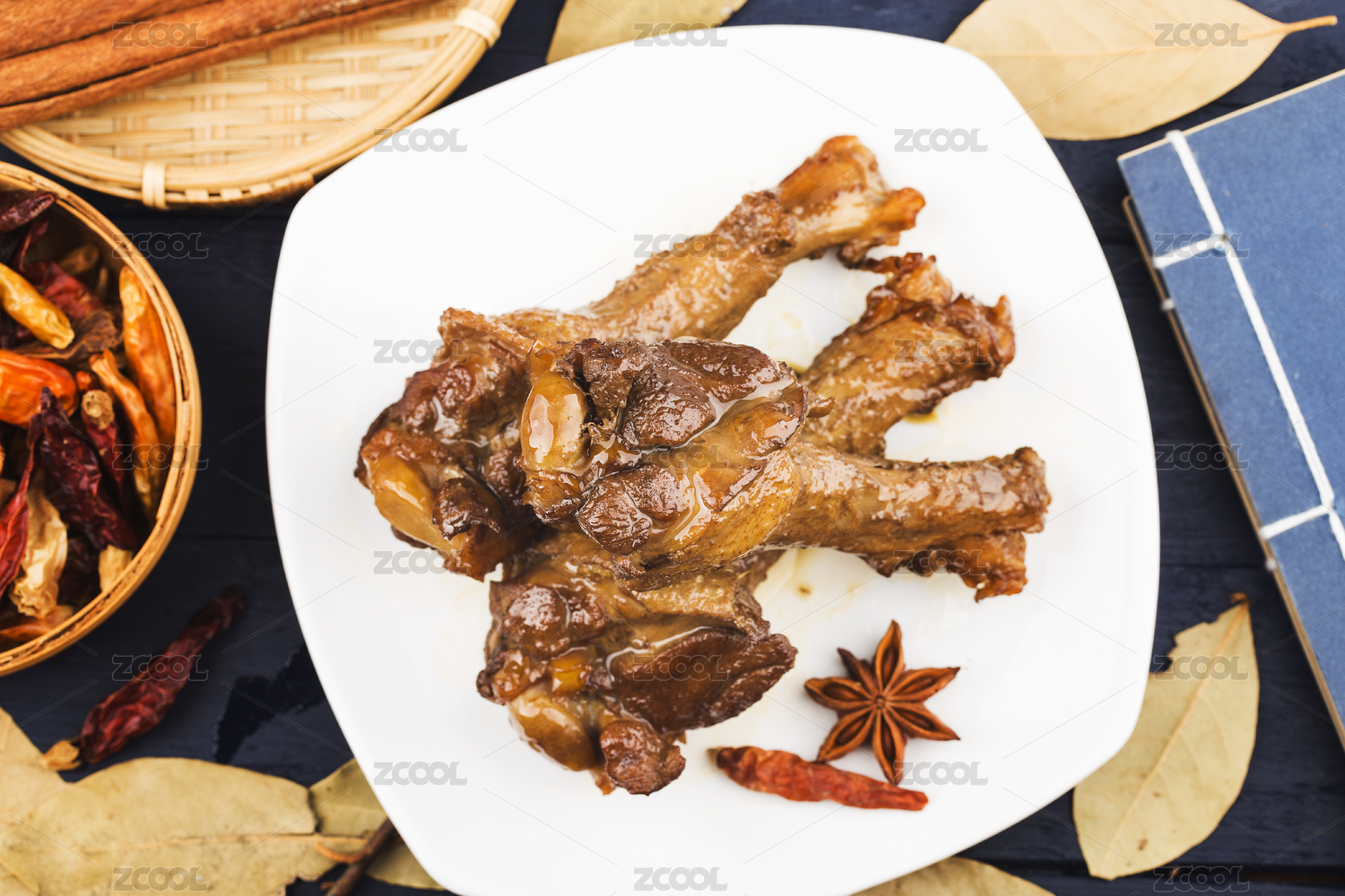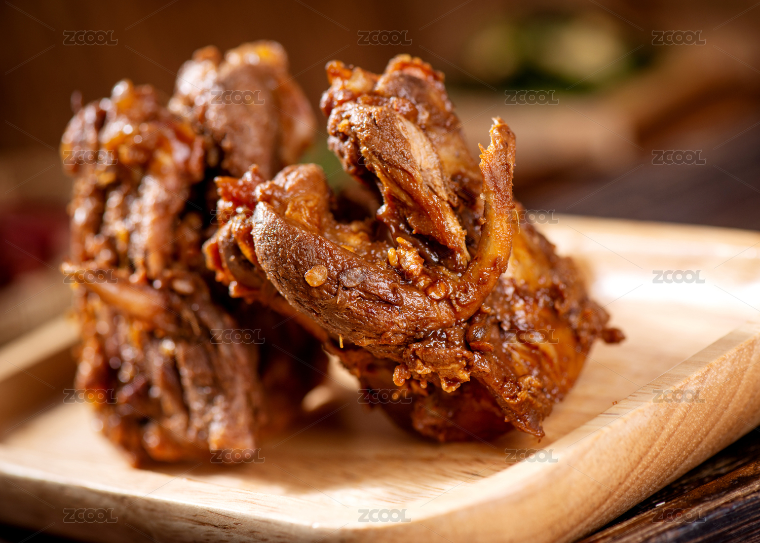 木纹背景上餐具中摆放的麻辣鸭锁骨