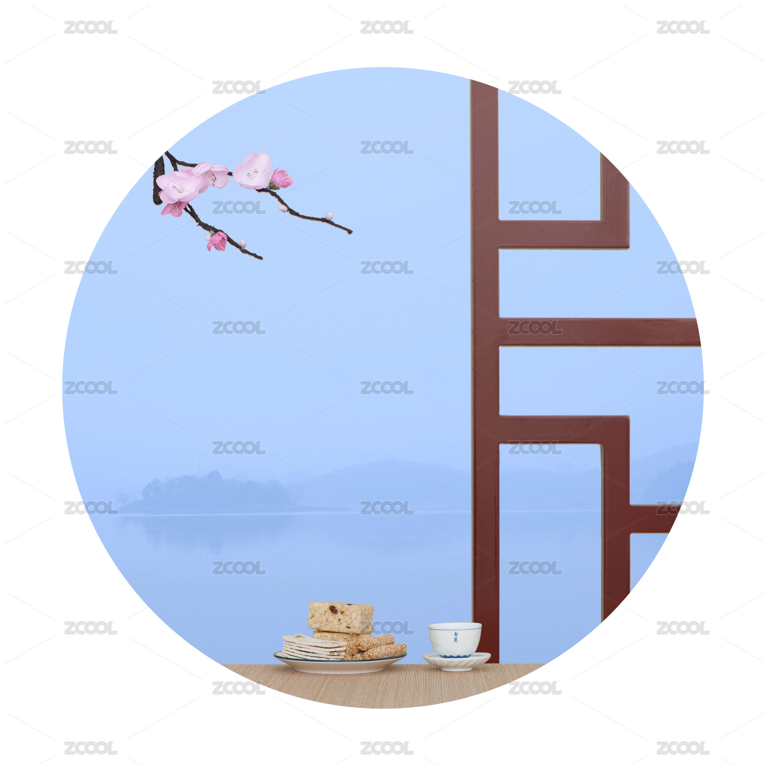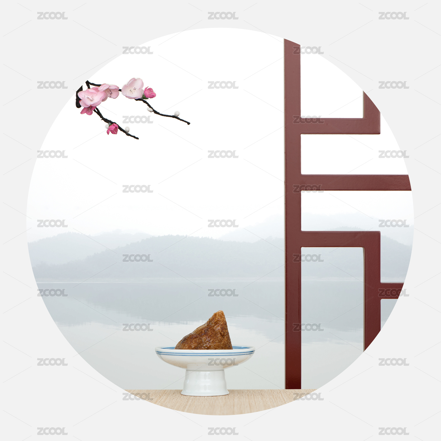 中国国画风格,放在窗棂边上的一个高脚盘装着粽子