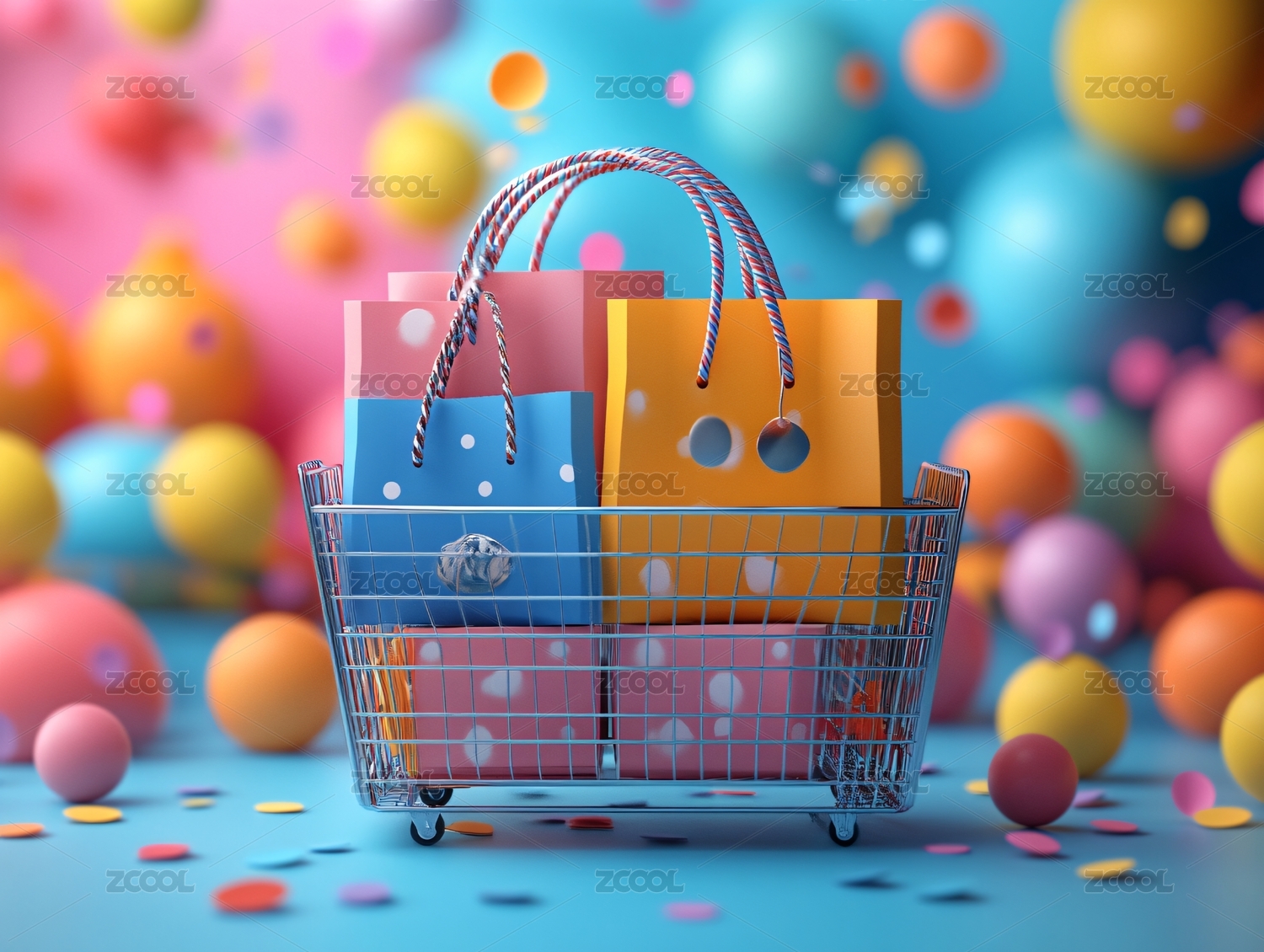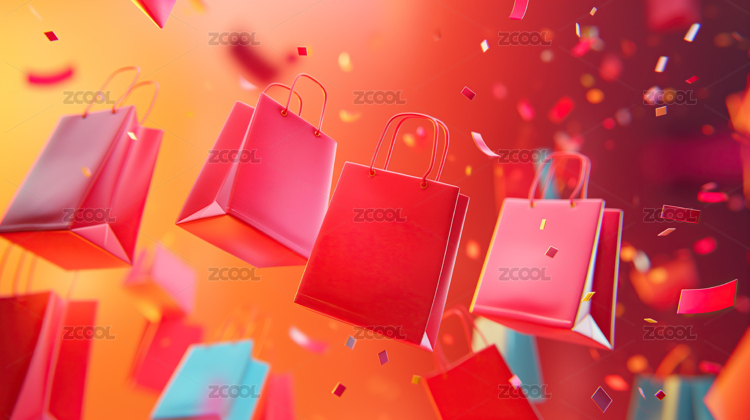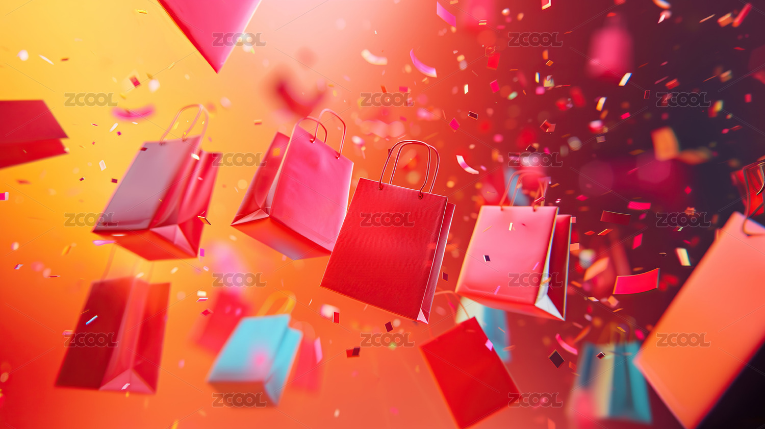 充满活力背景上漂浮购物袋