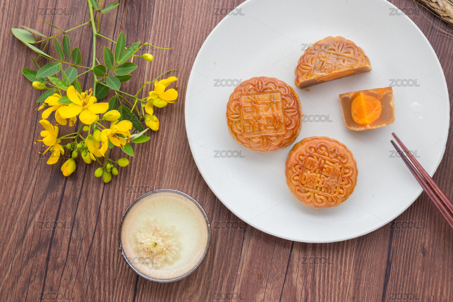 中秋节传统美食月饼与茶水特写古窗棂木桌面