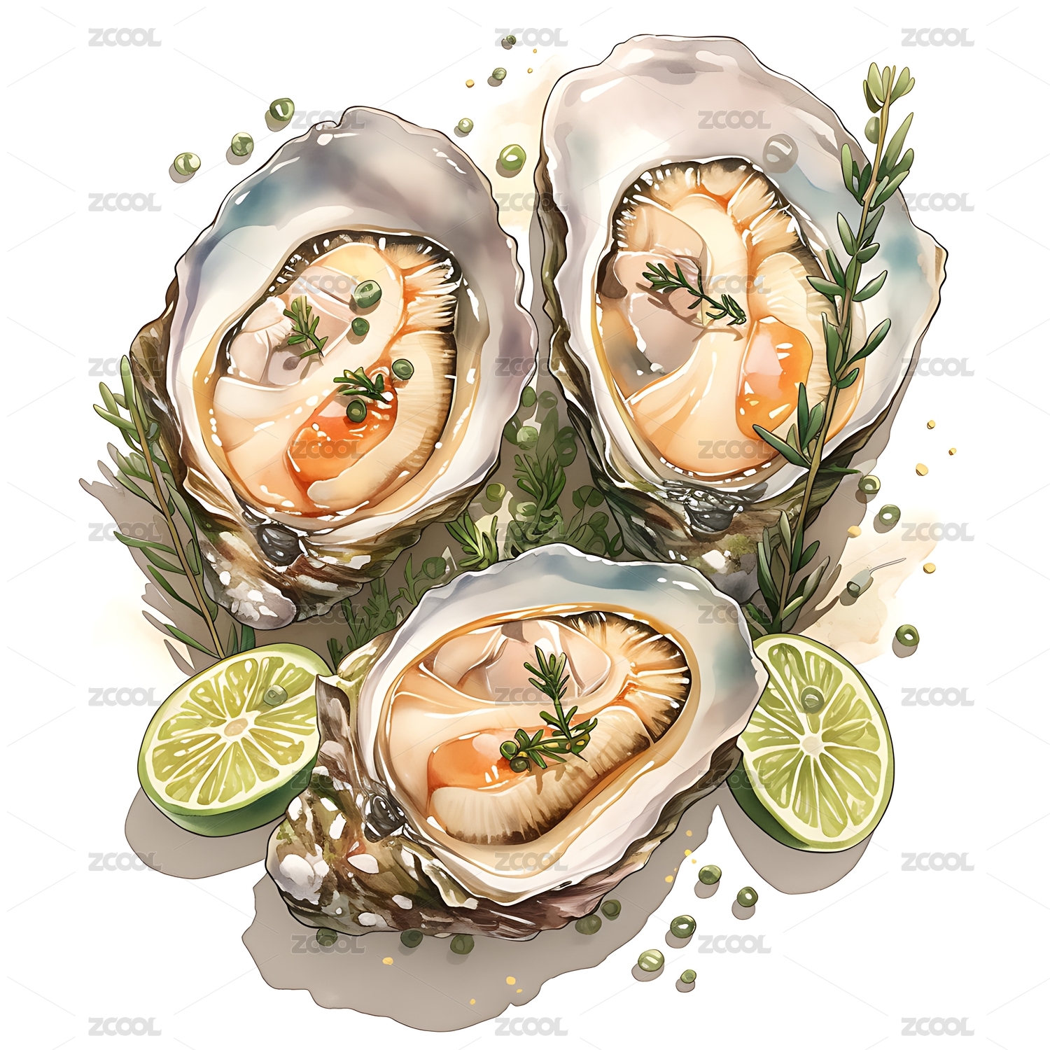 插画,食物,食品,白色背景,水彩,油画,美食,美味,两个,生蚝