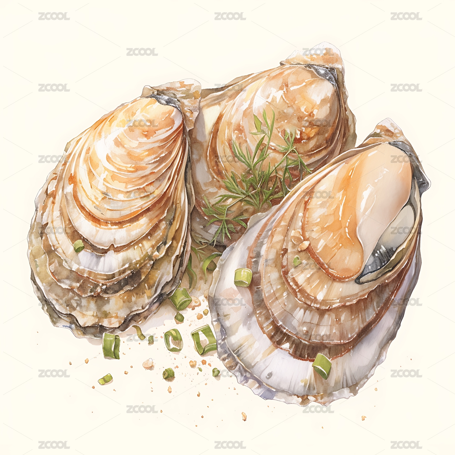 两个美味的烤生蚝水彩插画