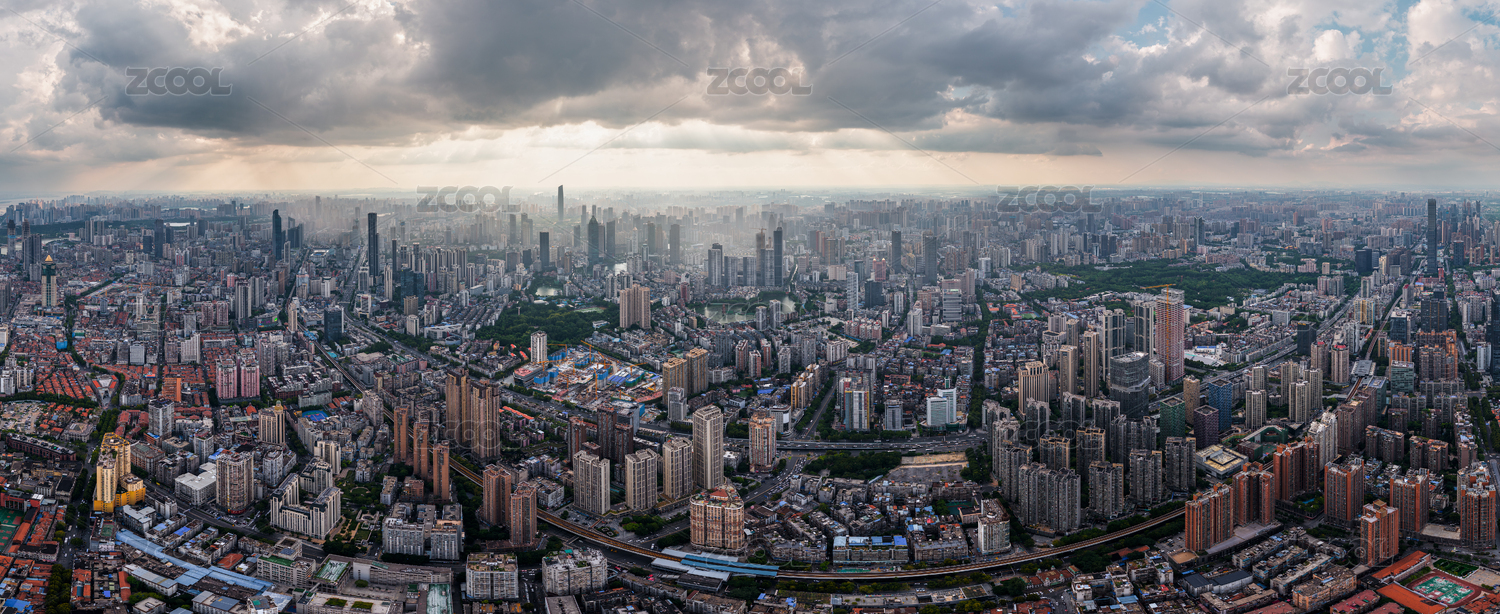 广州珠江岸城市建筑群与日出云彩航拍长图