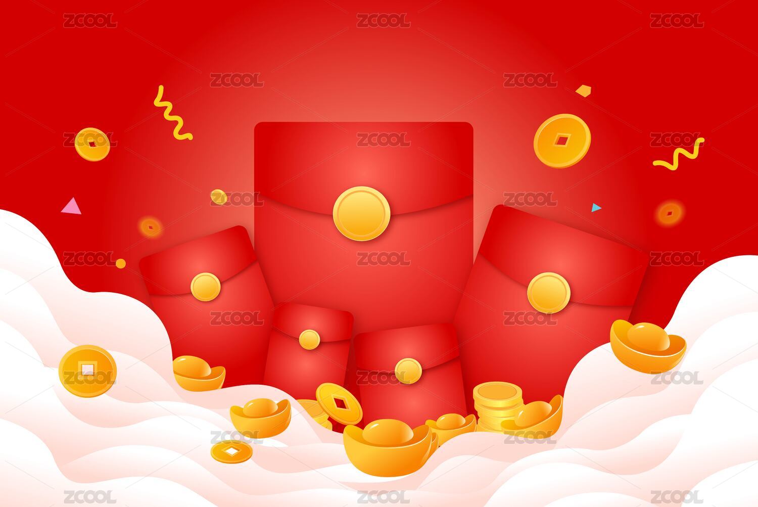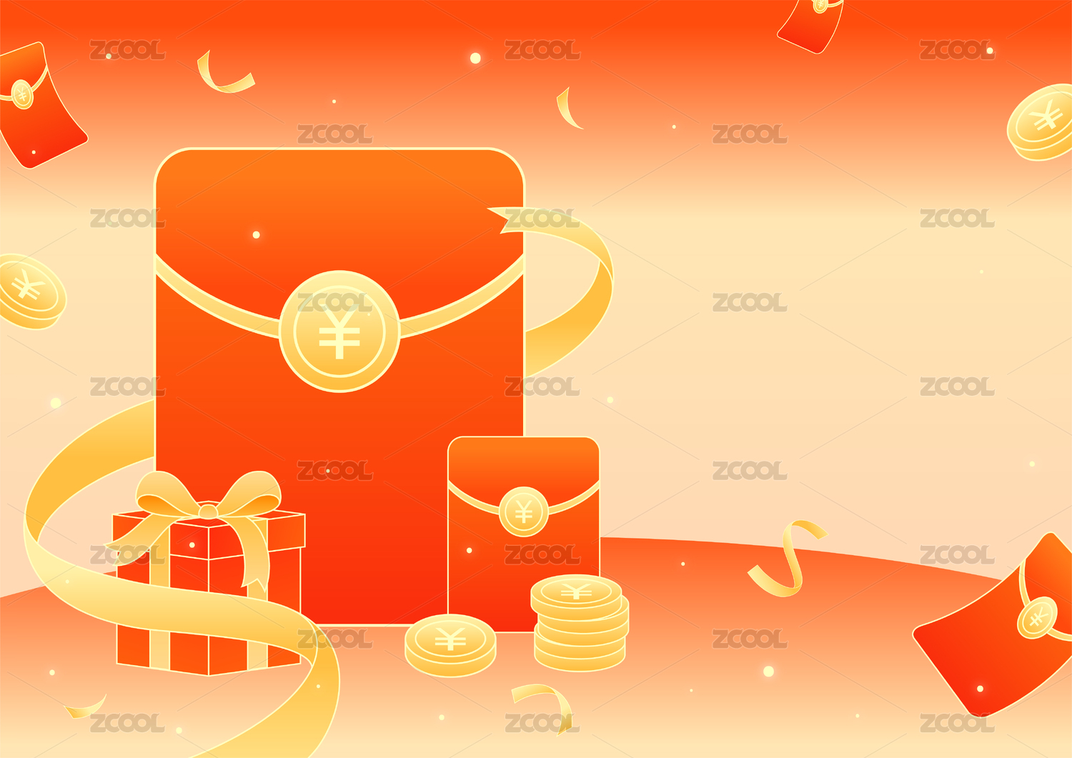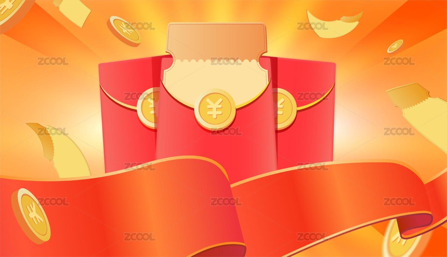 红丝绸促销红包金币优惠券插画