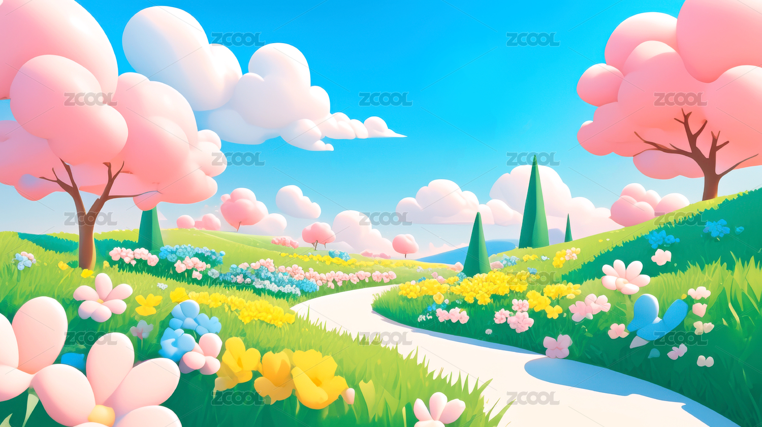 童话动画春天田园风光自然风景乐园卡通插画