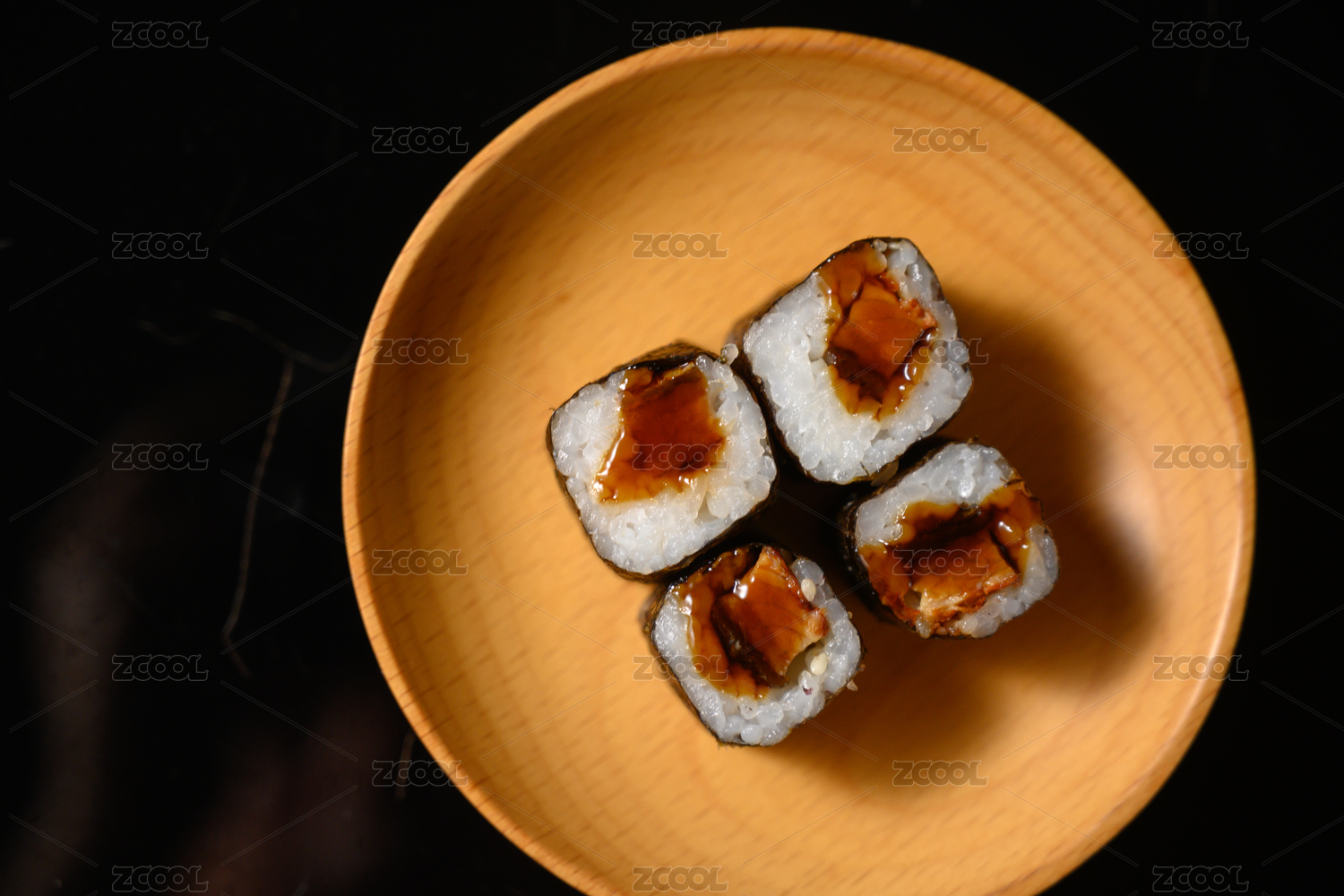 桌面上的盘子里的美味可口的吞拿鱼小卷