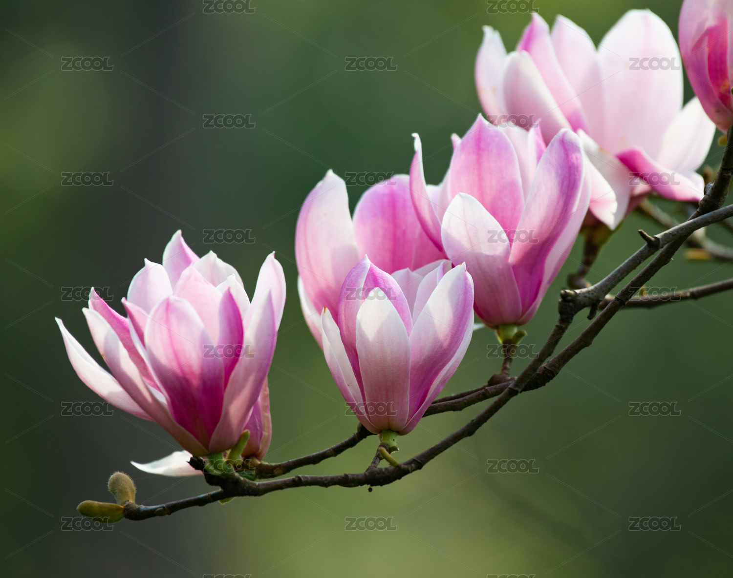 春天阳光照射绽开的紫色的玉兰花和花苞