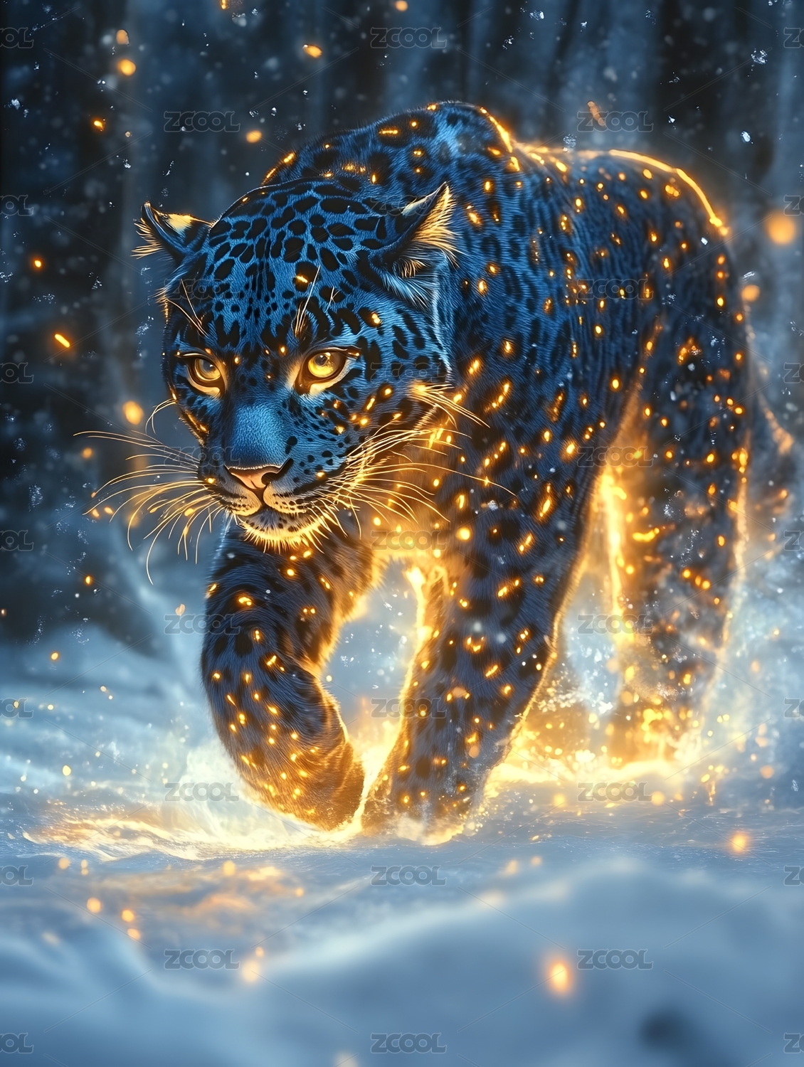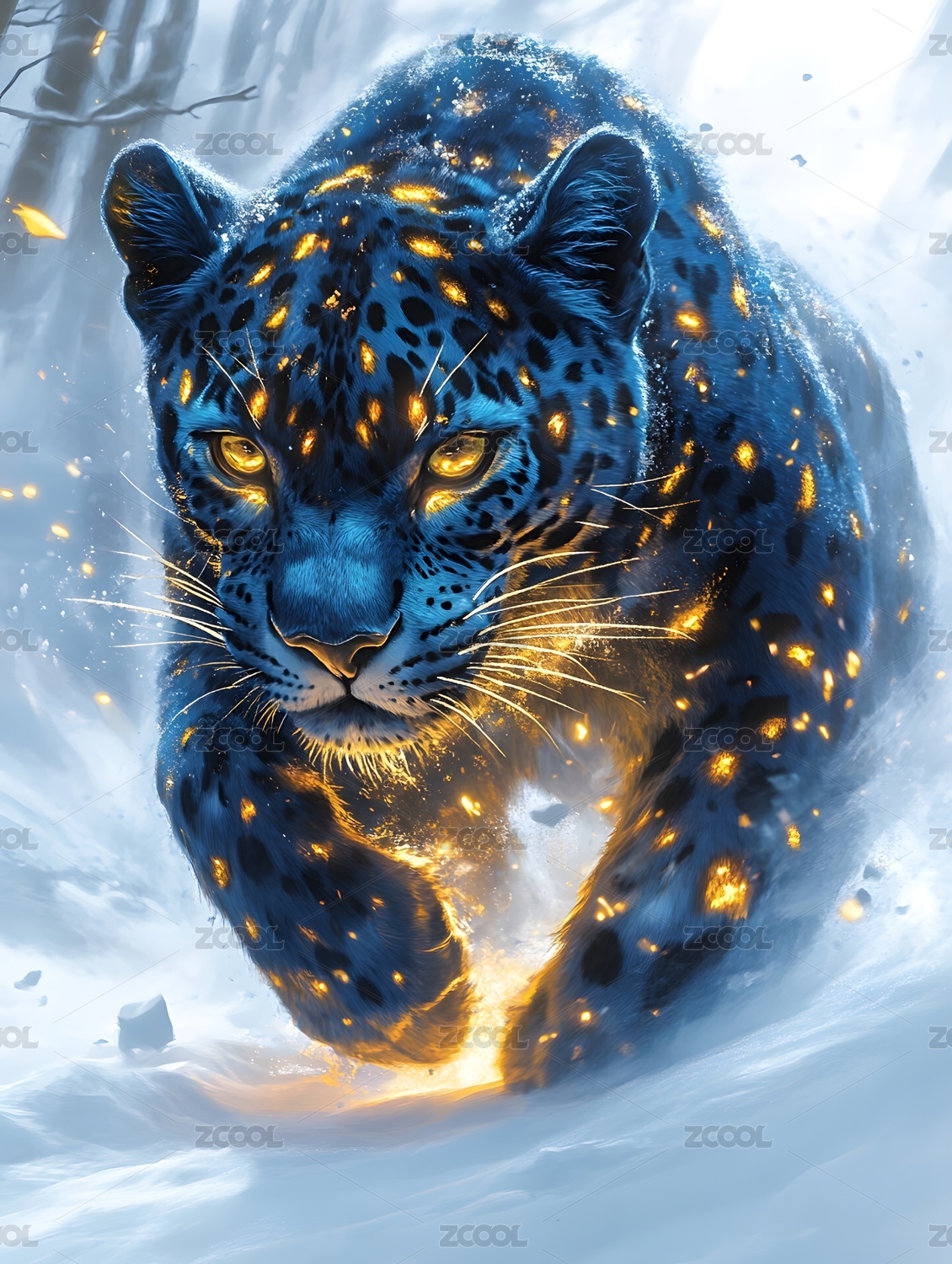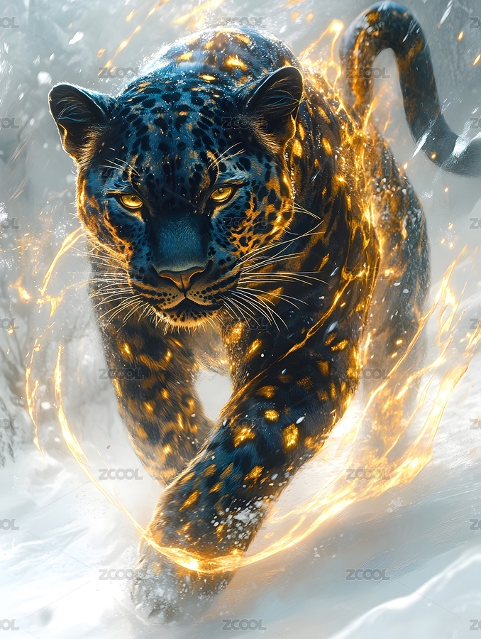 雪豹,黑豹,蓝色,金色,猎豹,金钱豹,金光,光效,雪地,冬天