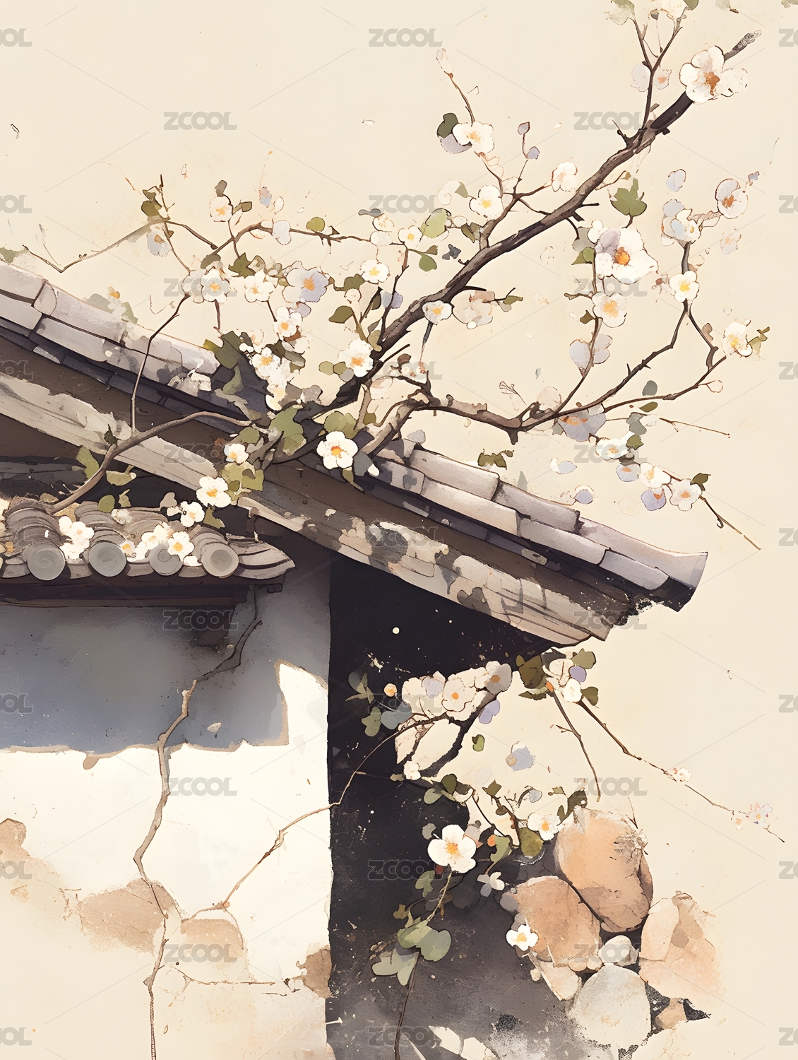 中国风,水墨,乡镇,小镇,城镇,腊梅,梨花,春天,白色,花朵