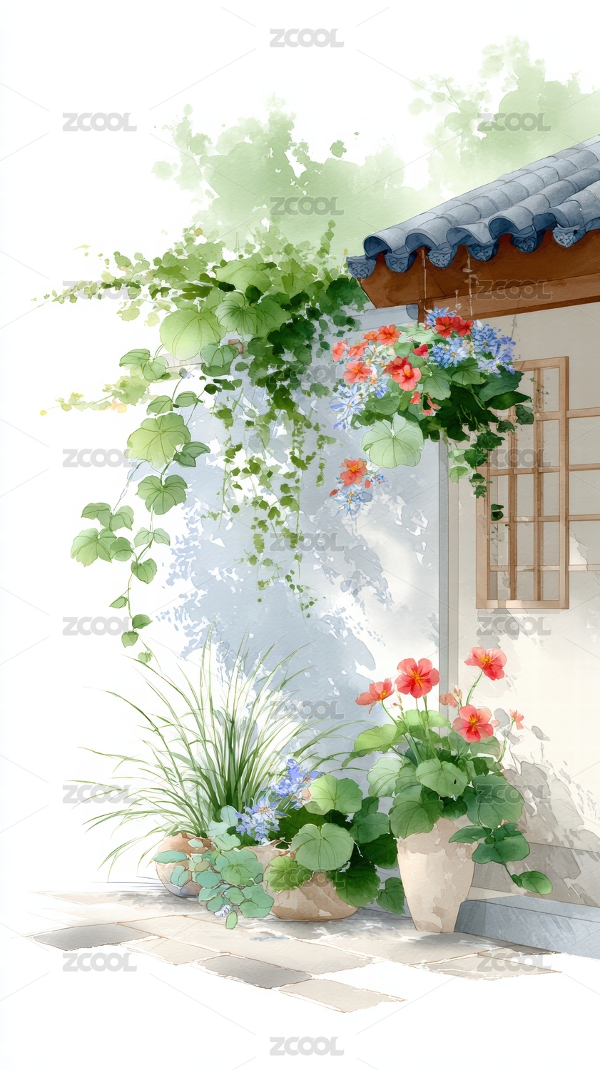 日式浮世绘风格 庭院一角的花卉植物