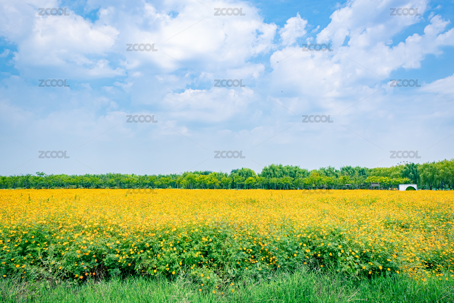 夏季晴朗天气下一大片黄色的金鸡菊花海