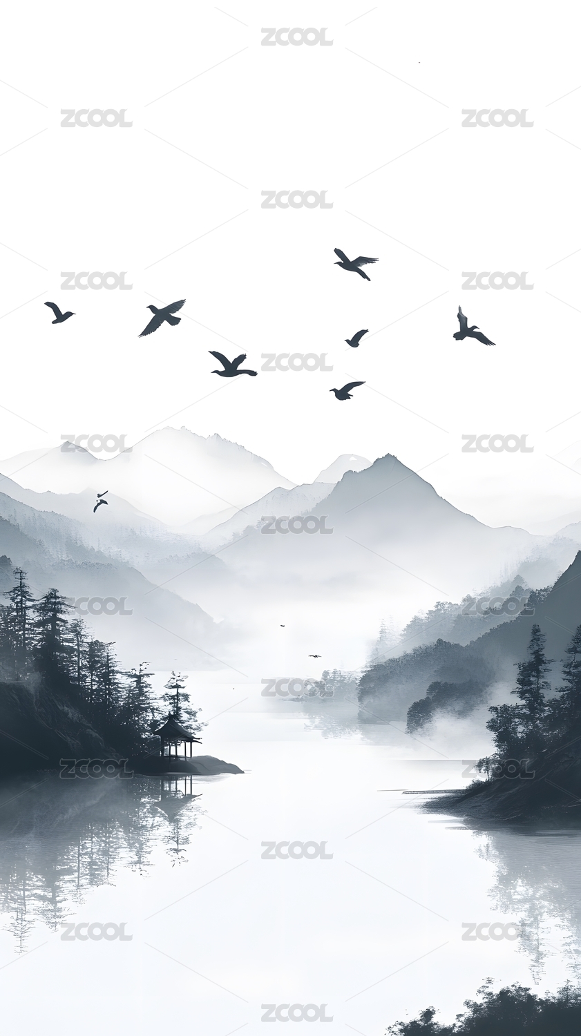 大雁穿过云雾飞过陡峭山峰,几只水鸟在水中捕鱼,倒映在平静的湖面上中国风插画背景海报
