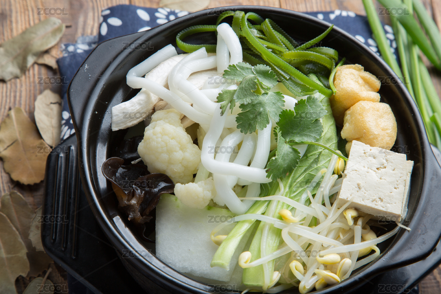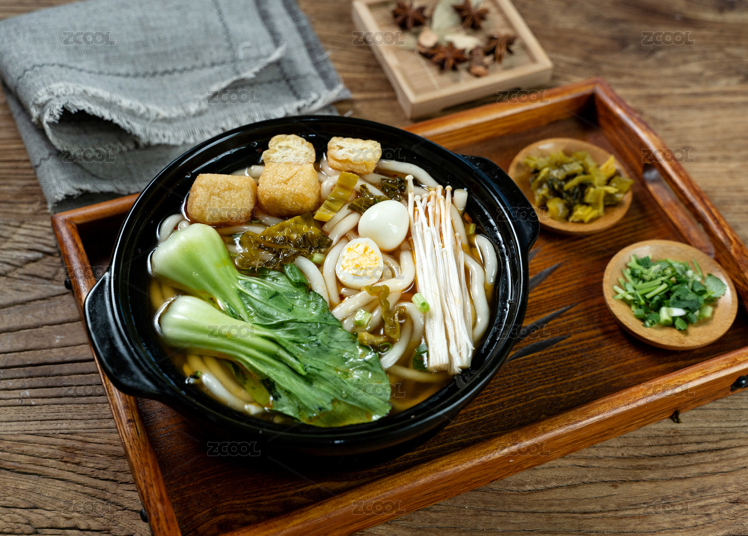 木桌上摆放的砂锅南瓜土豆宽粉