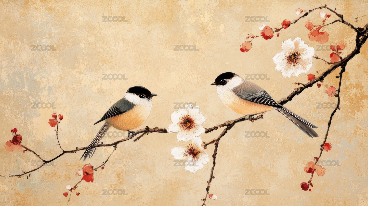 梅花枝头对望的国风小鸟