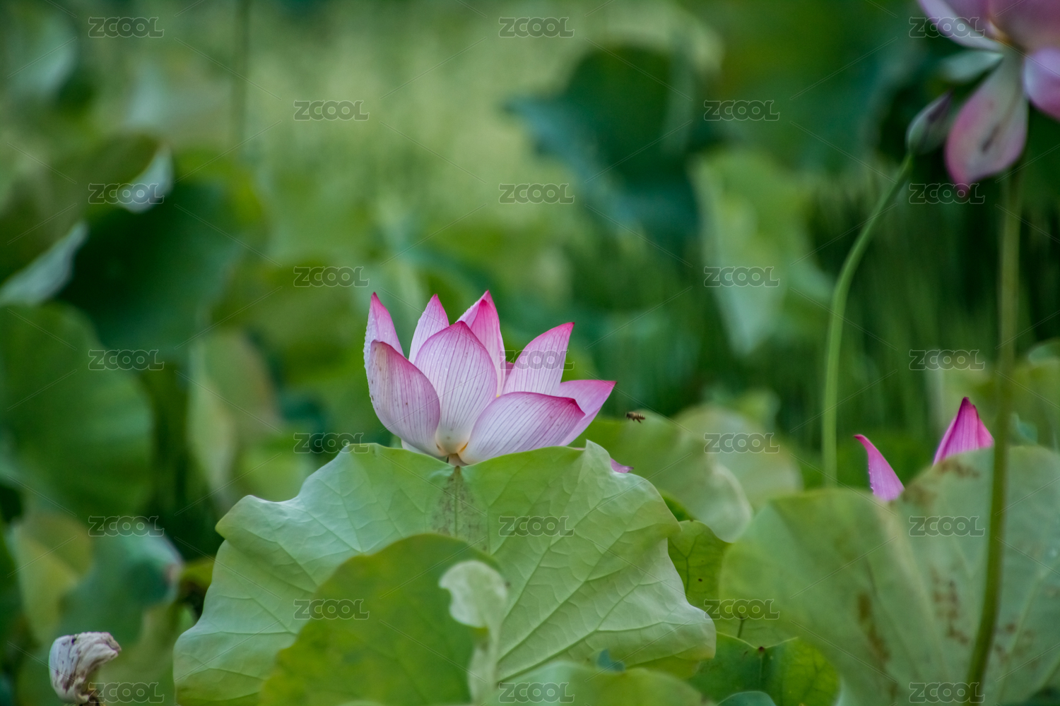 夏天绿色荷叶里的粉红色的荷花