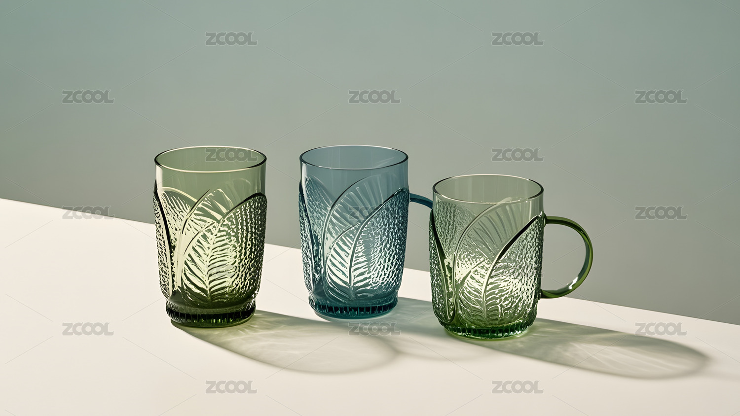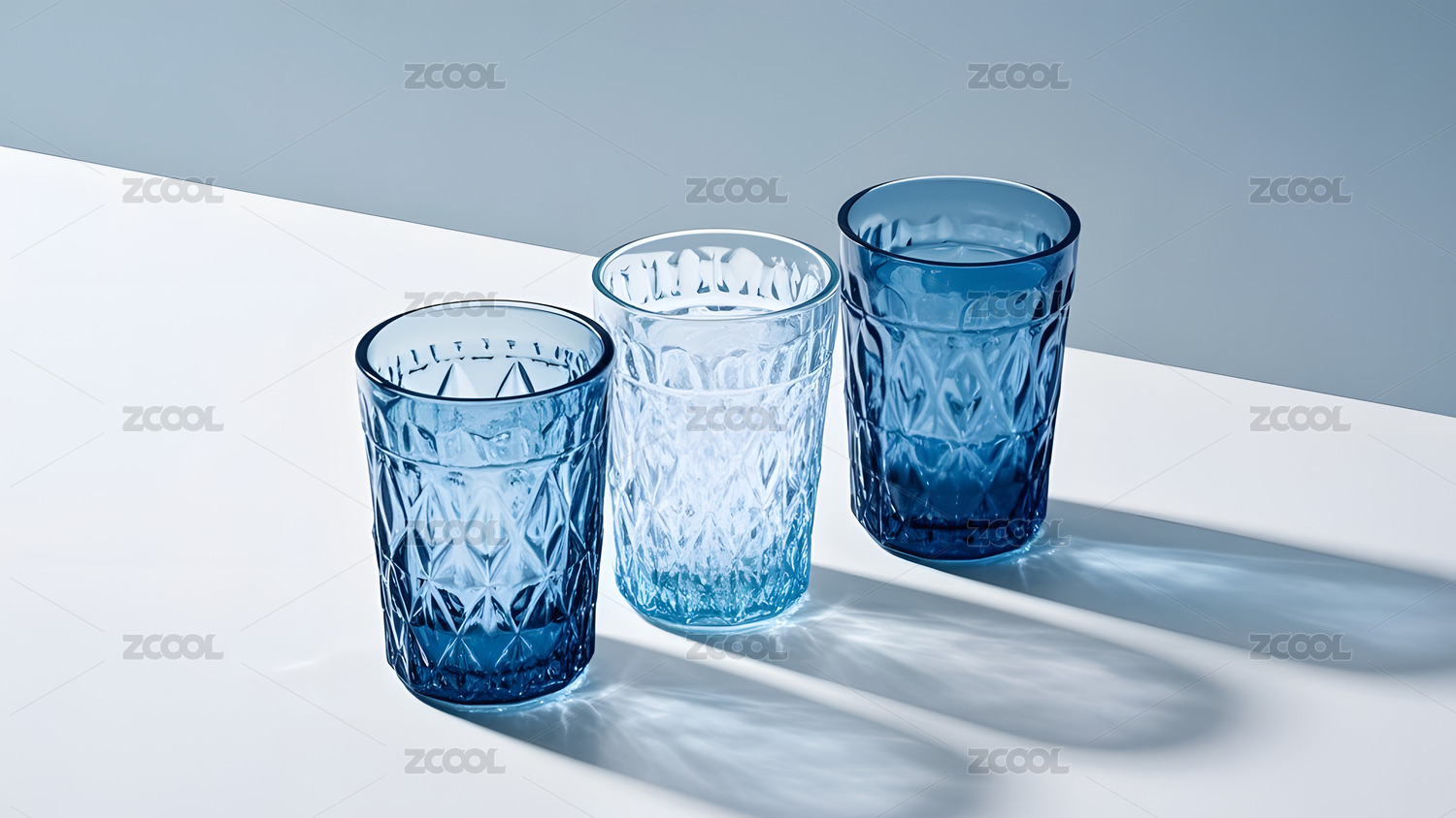 白色台面上盛橙色果汁的带花纹玻璃杯